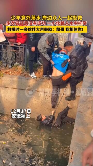 少年意外落水,岸邊眾人一起搭救,多次嘗試后沒有成功,一小伙選擇跳入水中托舉。救援時,一旁伙伴大聲鼓勵少年:“凱哥,我相信你!”#見義勇為#溫情