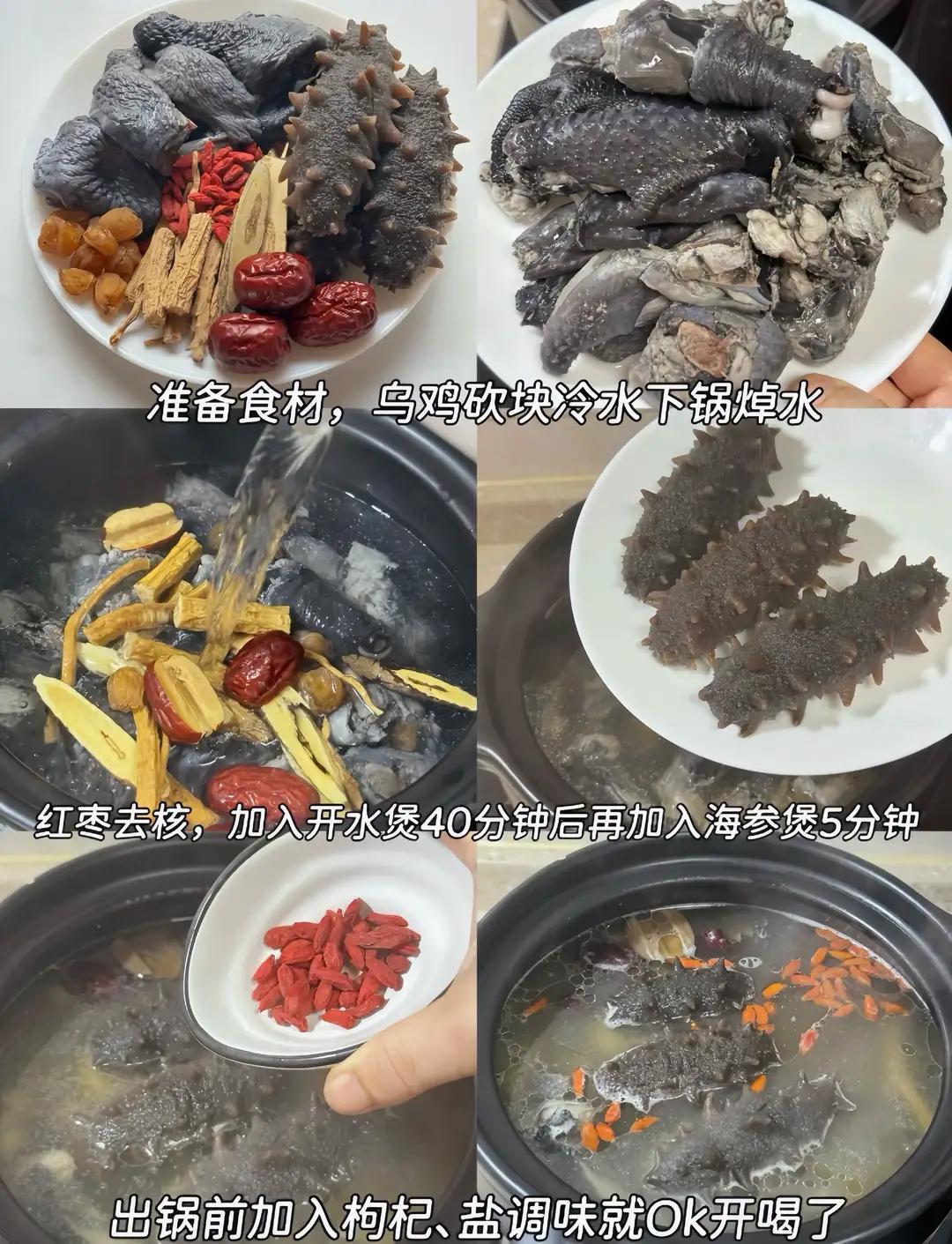 1. 備料是關鍵:烏雞半只,斬成塊,冷水下鍋,加幾片姜,煮開后撇去浮沫,撈出洗凈。這是湯色清澈的第一步。泡發好的海參1-2條(干海參泡發需數日,切記全程用具無油)。紅棗5-6顆,去核;枸杞一小把,姜2片。
