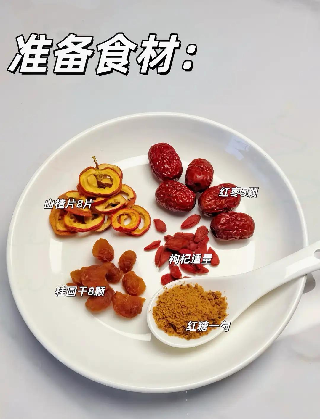 1. 準備材料:干桂圓8-10顆(去核),干山楂片5-6片,紅棗5顆(去核更不上火),枸杞一小把,紅糖適量。