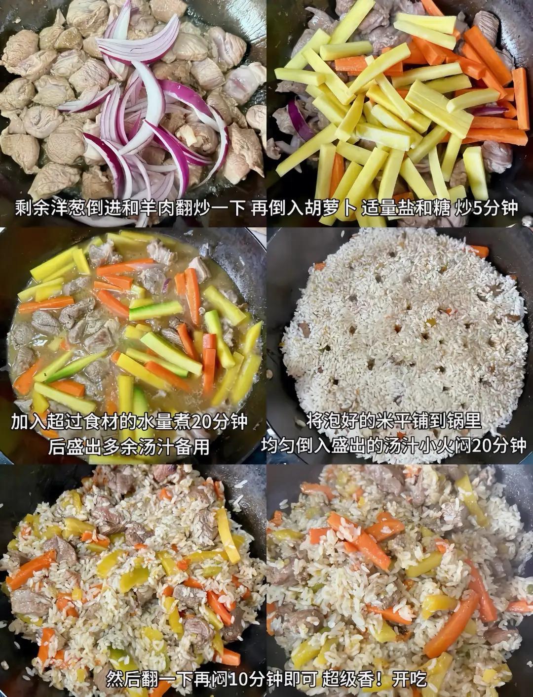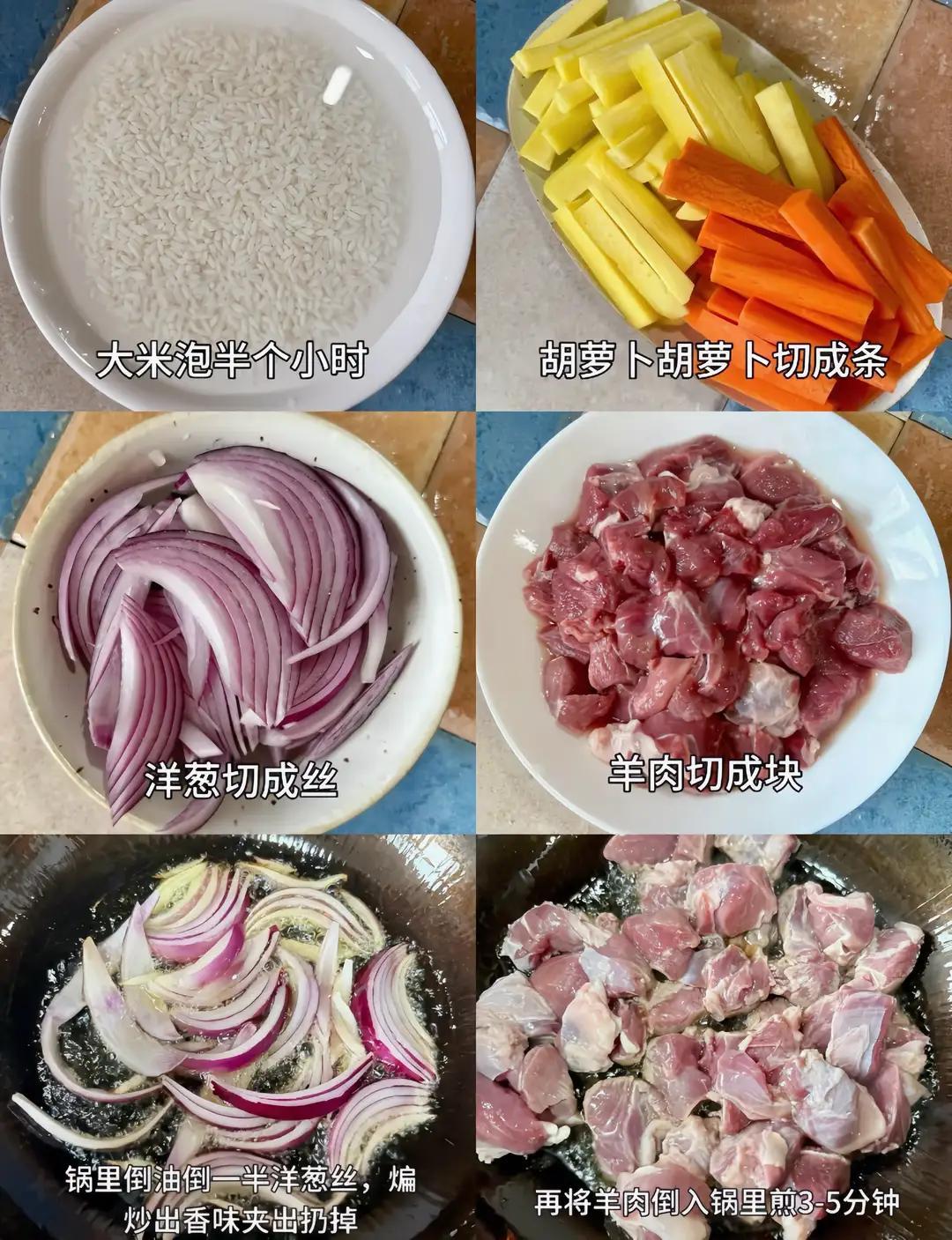 1. 處理食材:羊腿肉或羊排400克,切塊,用清水泡半小時去血水。胡蘿卜1-2根切粗條,洋蔥半個切絲。大米提前浸泡半小時。
