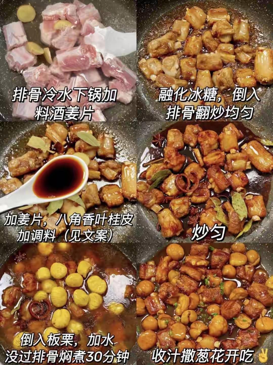 2. 煎炒上色:鍋燒熱倒油,放幾顆冰糖,小火炒化成棗紅色(別炒焦),倒入排骨快速翻炒,讓每塊都裹上糖色。加姜片、蔥段、兩個八角、一片香葉炒香。
