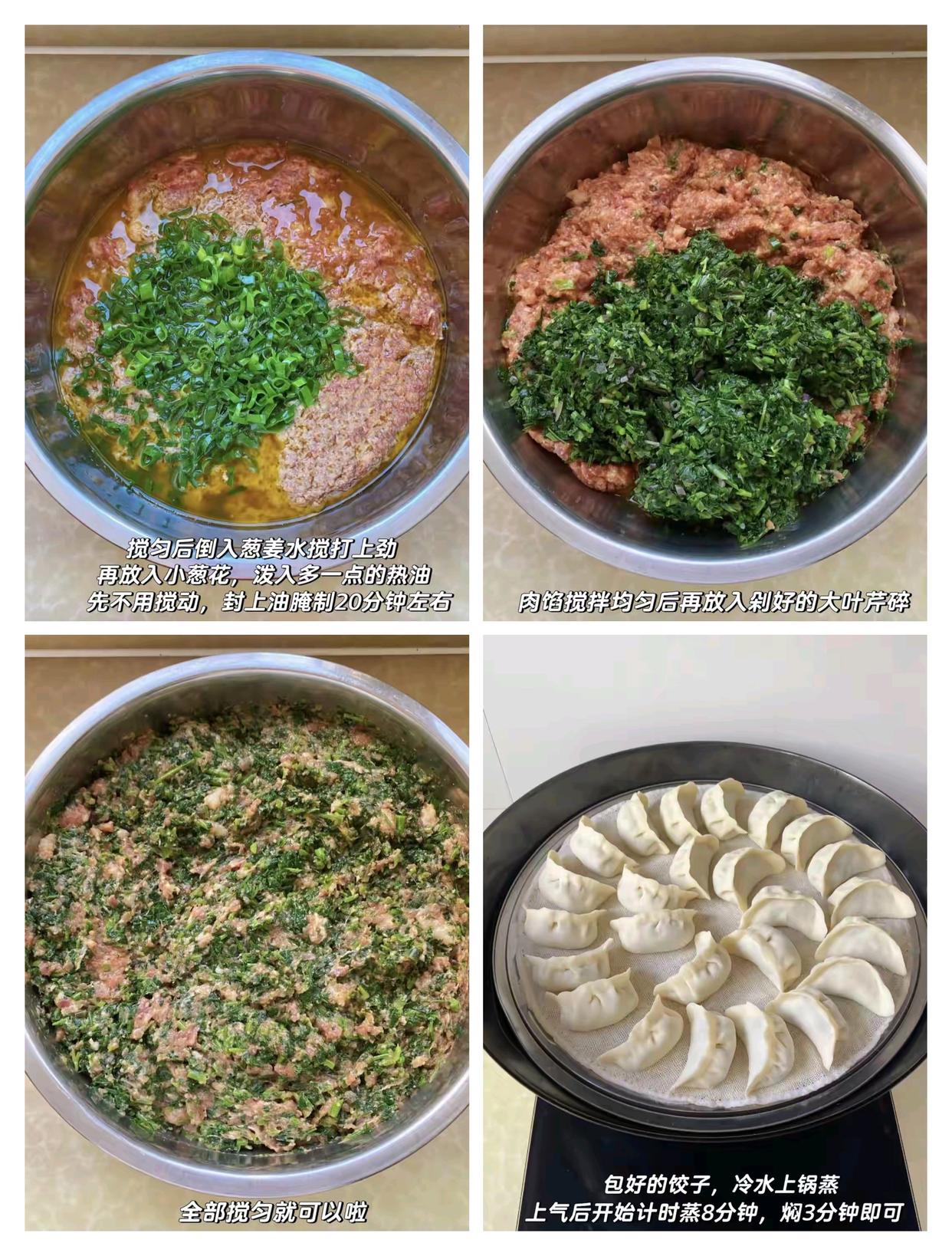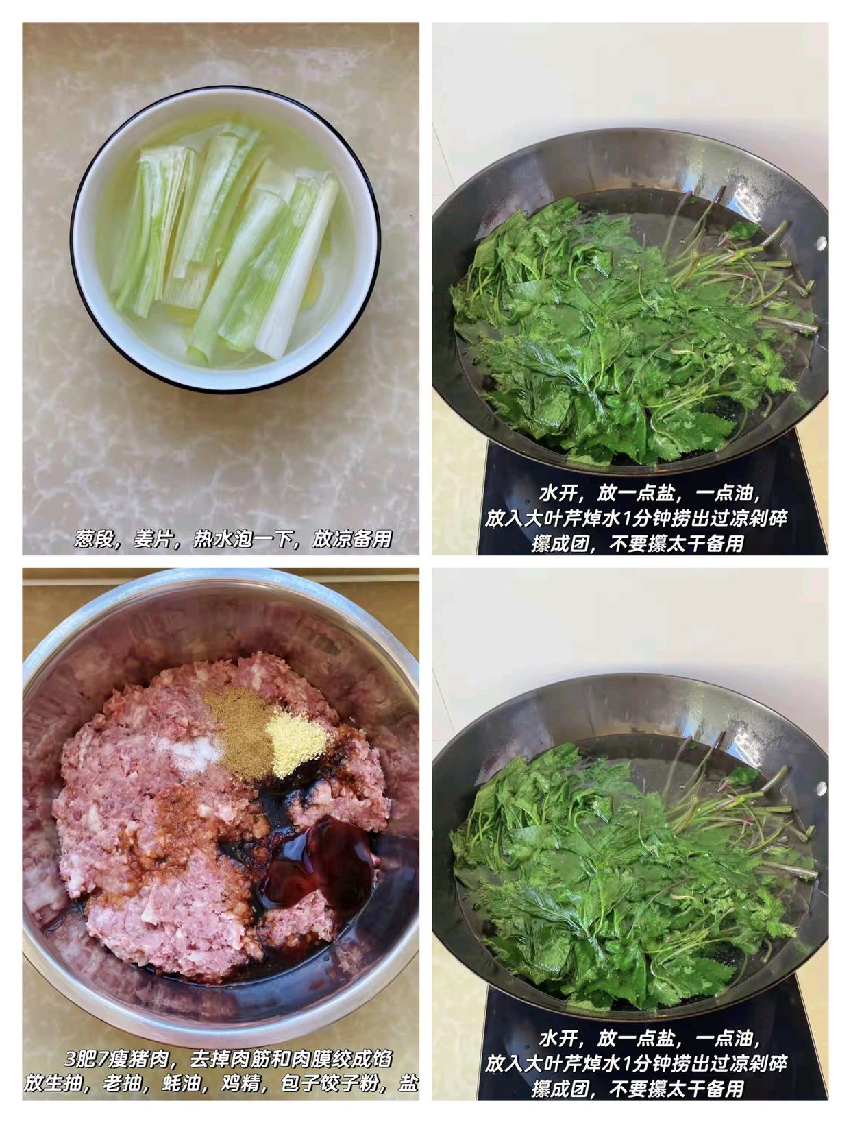 1. 處理食材:五花肉餡用蔥姜花椒水打進去,加生抽、鹽、一點香油攪上勁。大葉芹洗凈,用開水快速燙一下(焯水),撈出過涼,擠干水分,切成細末。