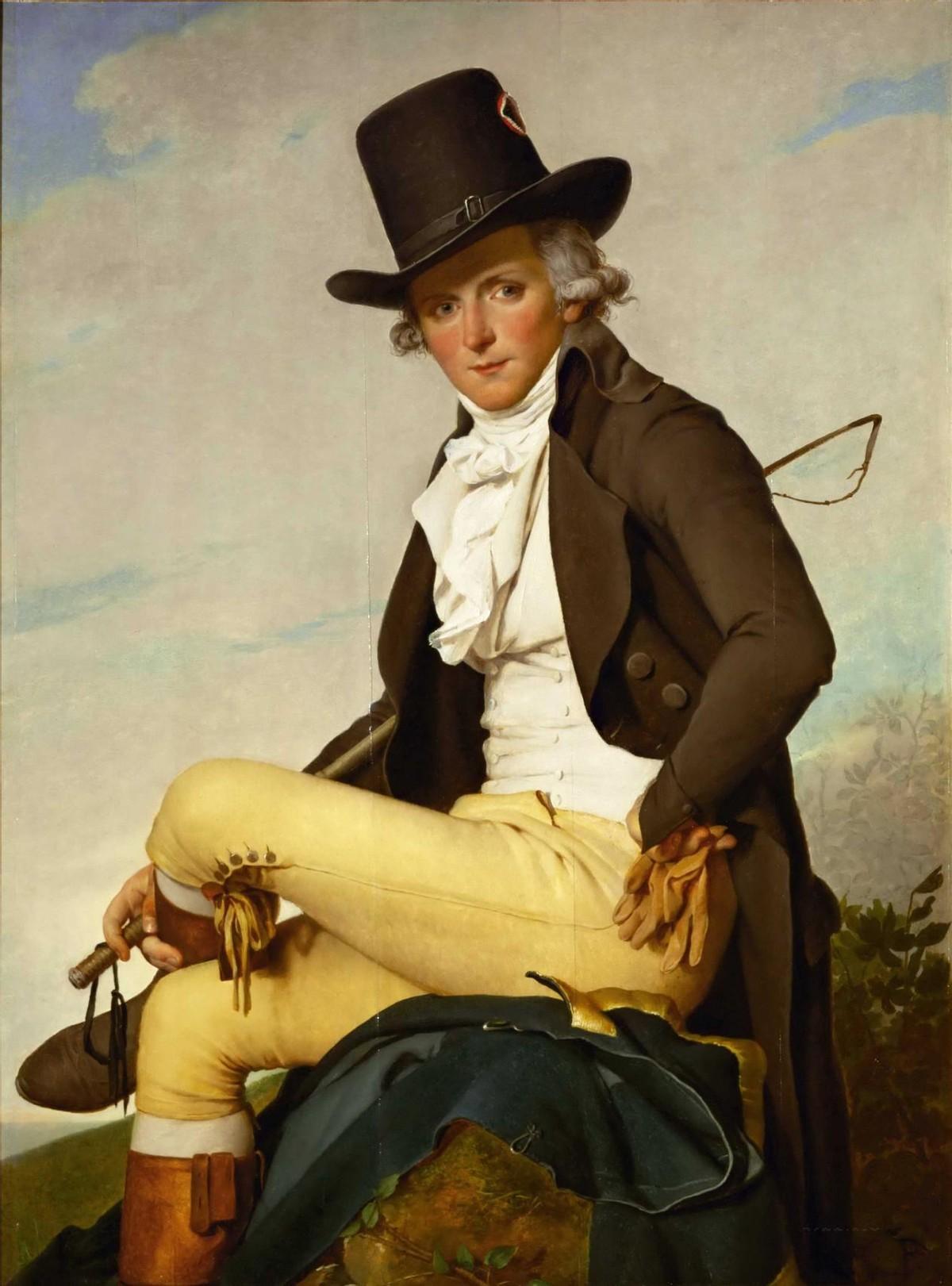 這樣的背景下,殘存的進(jìn)步貴族自然心有余悸,一方面擁抱共和國(guó)蔚然成風(fēng)的新古典主義,一方面自然要和之前奢靡的裝束打扮劃清界限——這其中,自然包括放棄材質(zhì)名貴,工藝復(fù)雜的絲綢裝飾長(zhǎng)襪,轉(zhuǎn)而以質(zhì)樸的長(zhǎng)褲和小腿襪示人;