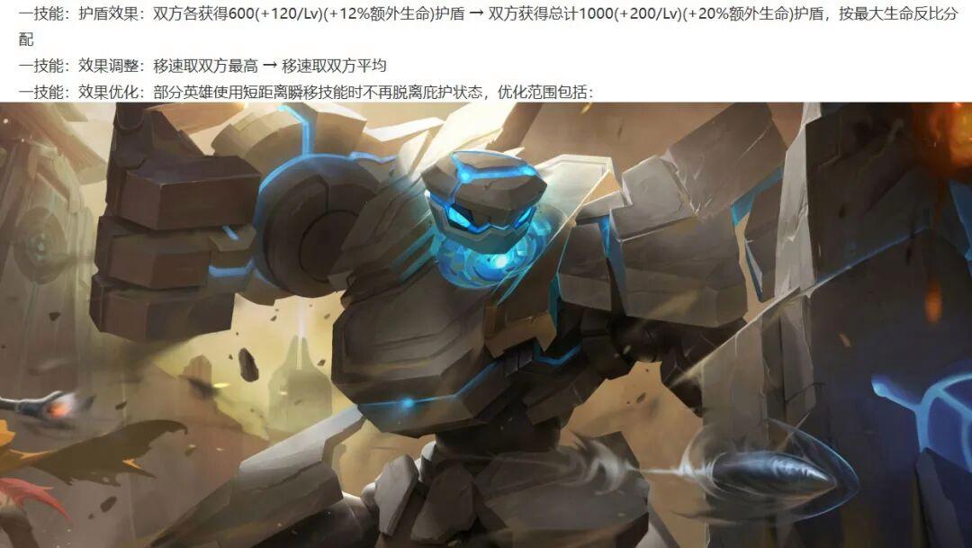 盾山削弱:1技能的護盾總量降低,脆皮隊友獲得的護盾更厚,自身和前排隊友獲得的護盾更少。1技能在某些特殊組合下的移速降低,削弱了極端機動性。部分位移英雄更好適配盾山1技能,能搭配盾山的英雄變多了。