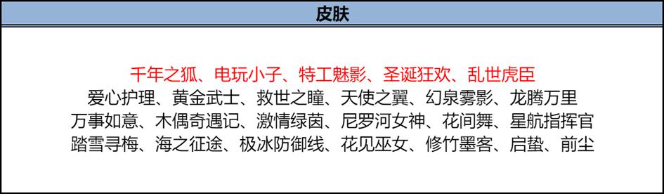 本期皮膚碎片上架了電玩小子、特工魅影、千年之狐、亂世虎臣、圣誕狂歡這五款史詩皮膚,可用皮膚碎片免費(fèi)兌換,皮膚碎片能在戰(zhàn)令幣商店免費(fèi)獲得。其次,還有激情綠茵、龍騰萬里、花間舞等精品皮膚可供兌換。