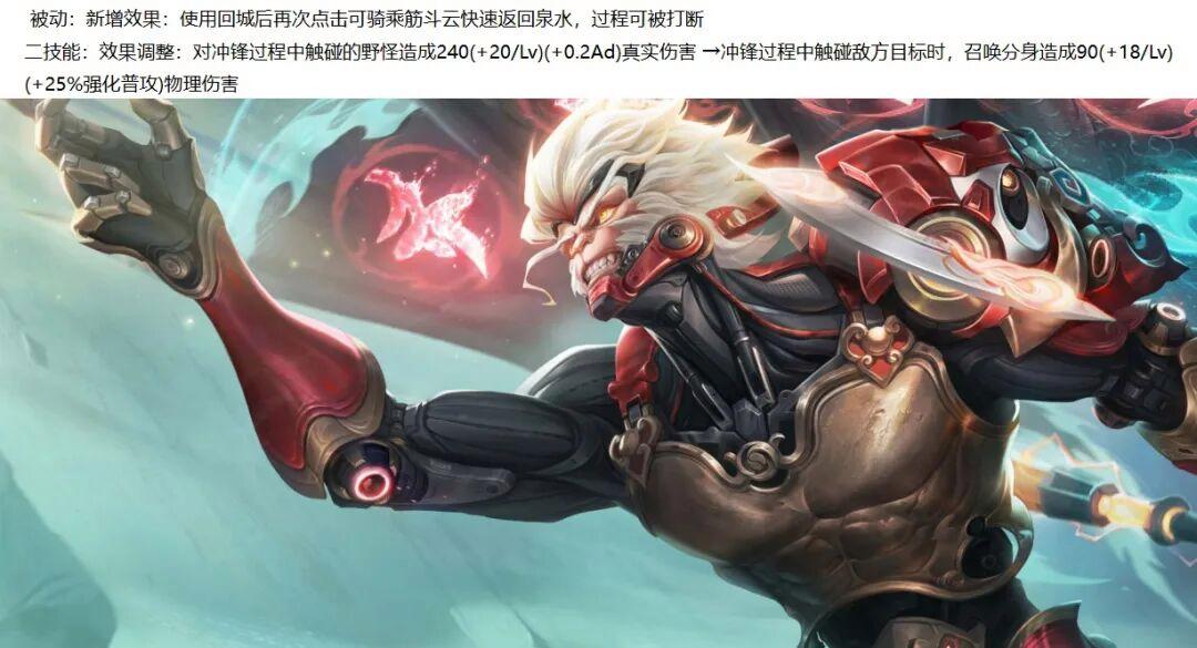 孫悟空加強(qiáng):連點(diǎn)兩次回城可以乘坐筋斗云飛回泉水(打斷機(jī)制跟回城一樣),2技能新增分身攻擊,起跳依舊可以斬殺殘血野怪。