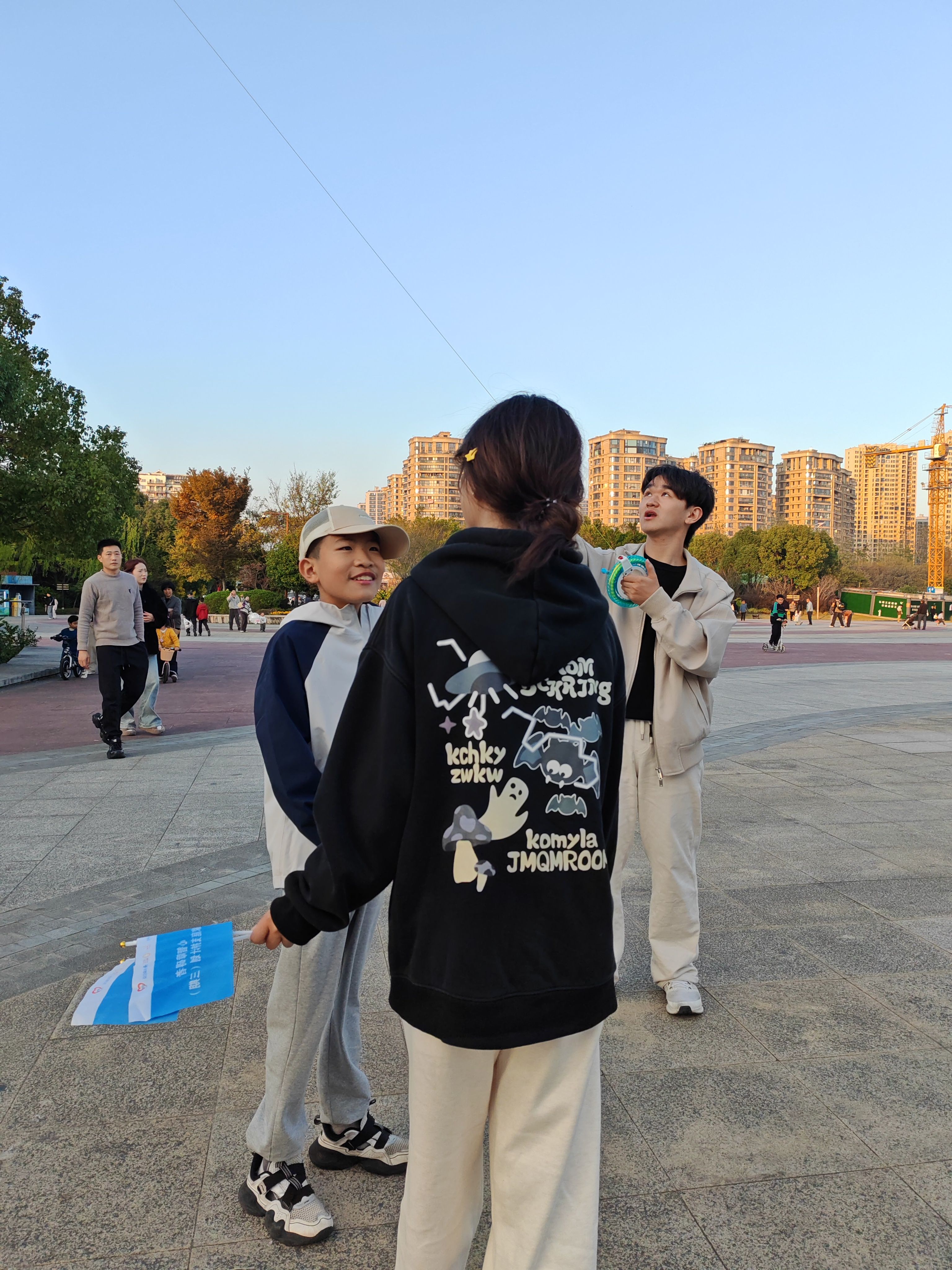 回到北大門外的廣場,終于到了放風箏的時刻。志愿者們拿出風箏組裝好并且理順風箏線,然然站在旁邊踮著腳尖,眼神緊緊鎖定風箏。第一次嘗試,風箏剛飛起來就落了地;第二次依舊沒能成功,然然的小嘴微微撅起,帶著一絲失落。就在大家調整姿勢準備第三次嘗試時,一陣風吹來,風箏順勢騰空而起,越飛越高。志愿者們趕緊固定好風箏線,把線軸遞給然然,讓他感受風箏升空的力量。