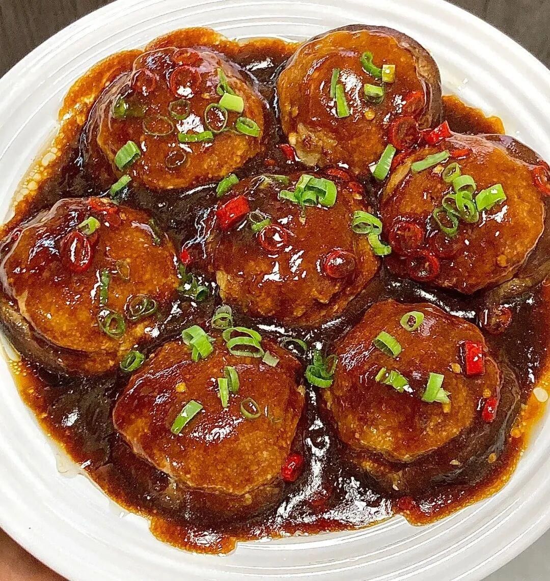 肉餡填入香菇傘蓋,按壓平整;鍋中倒油,油熱后香菇帶餡面朝下,小火煎3-4分鐘至肉餡定型金黃。