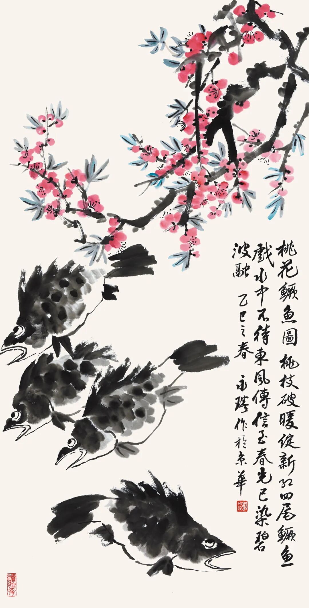 桃枝破暖綻新紅,四尾鱖魚戲水中。