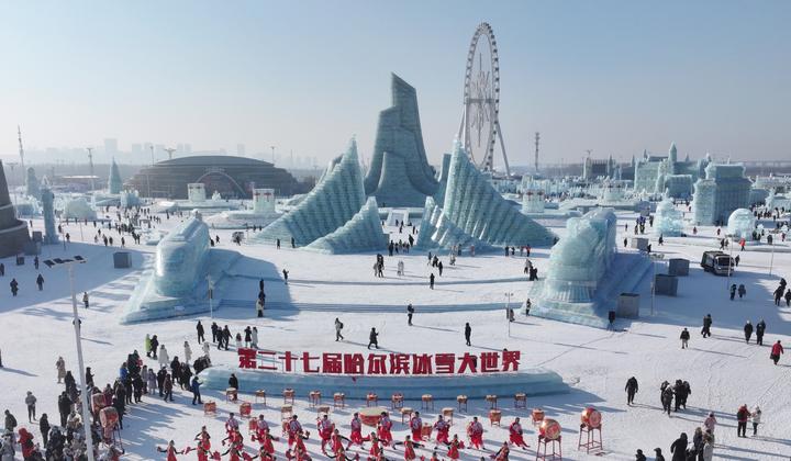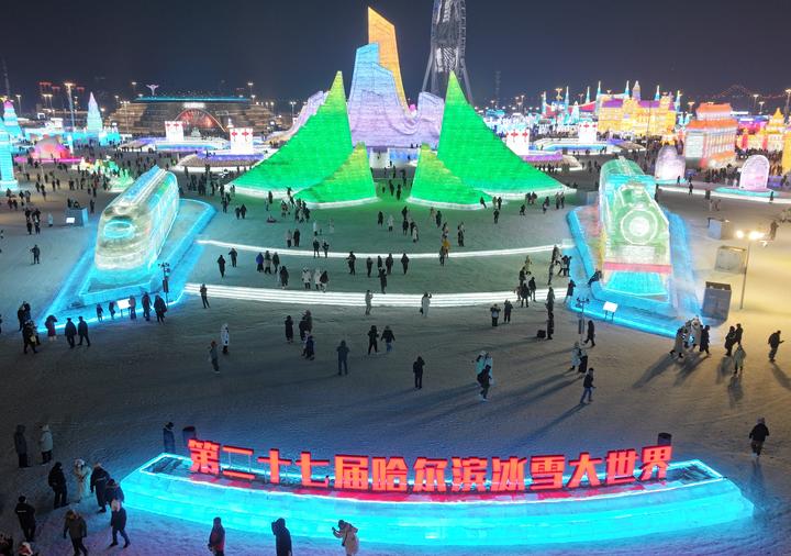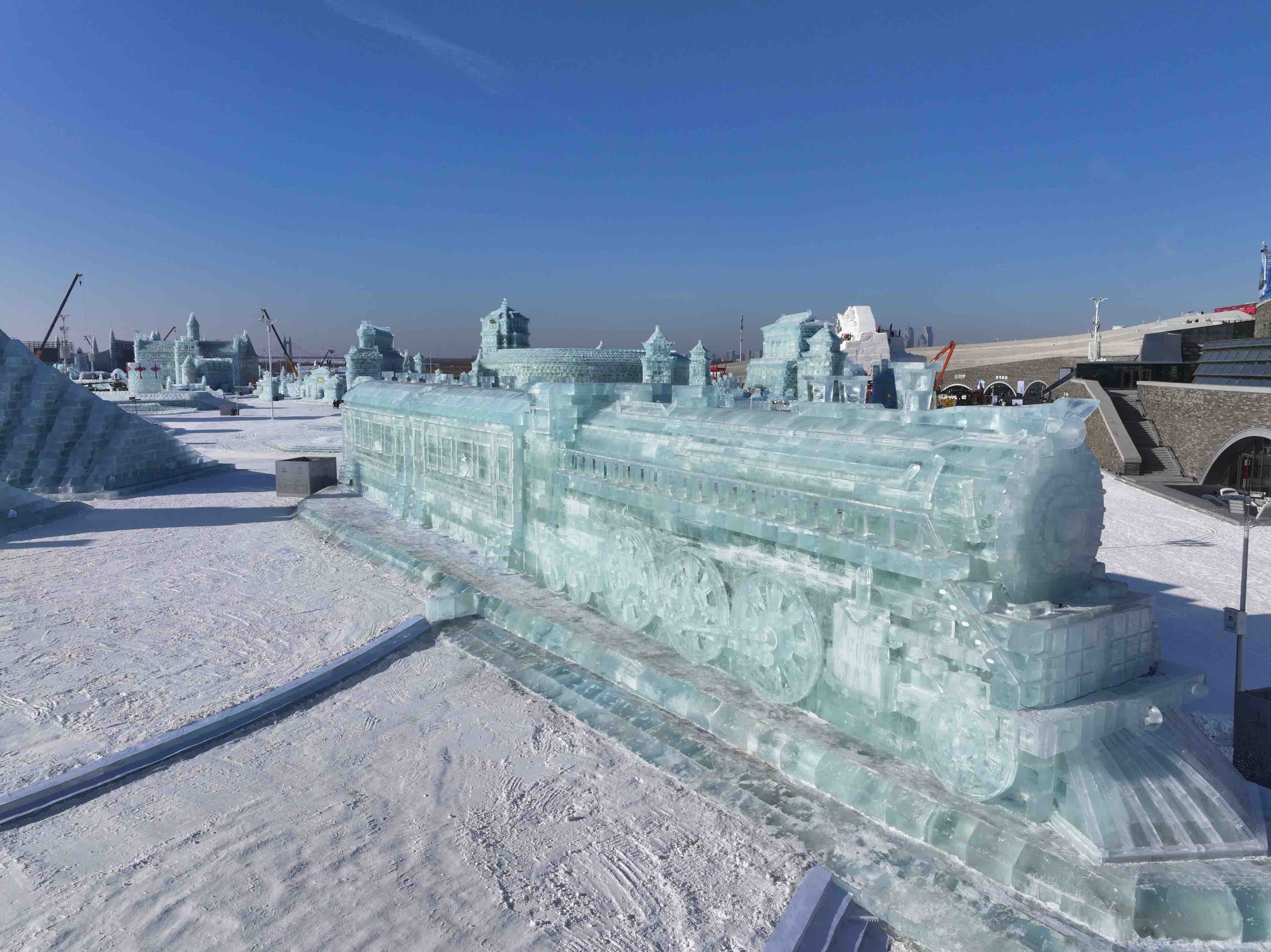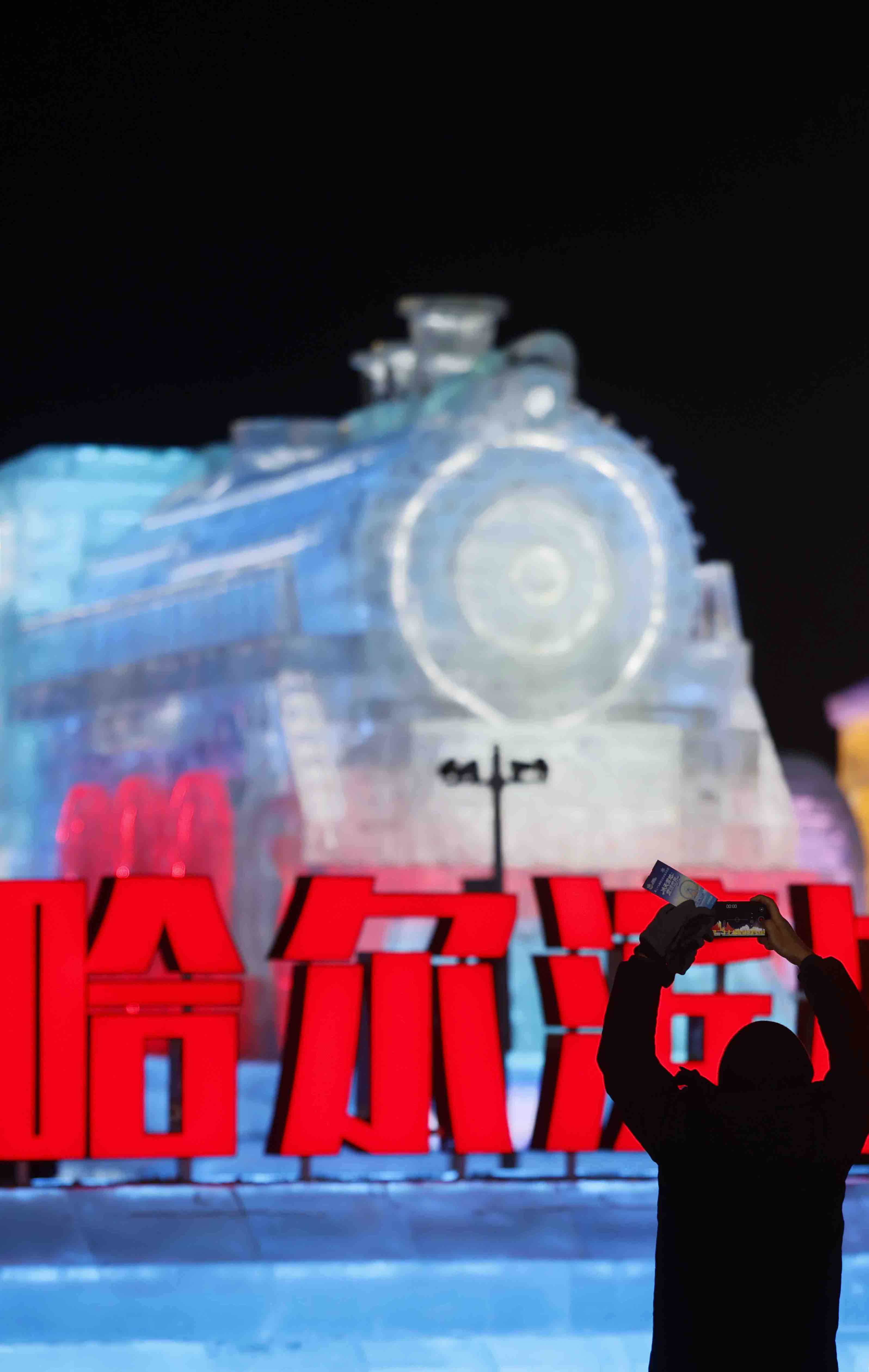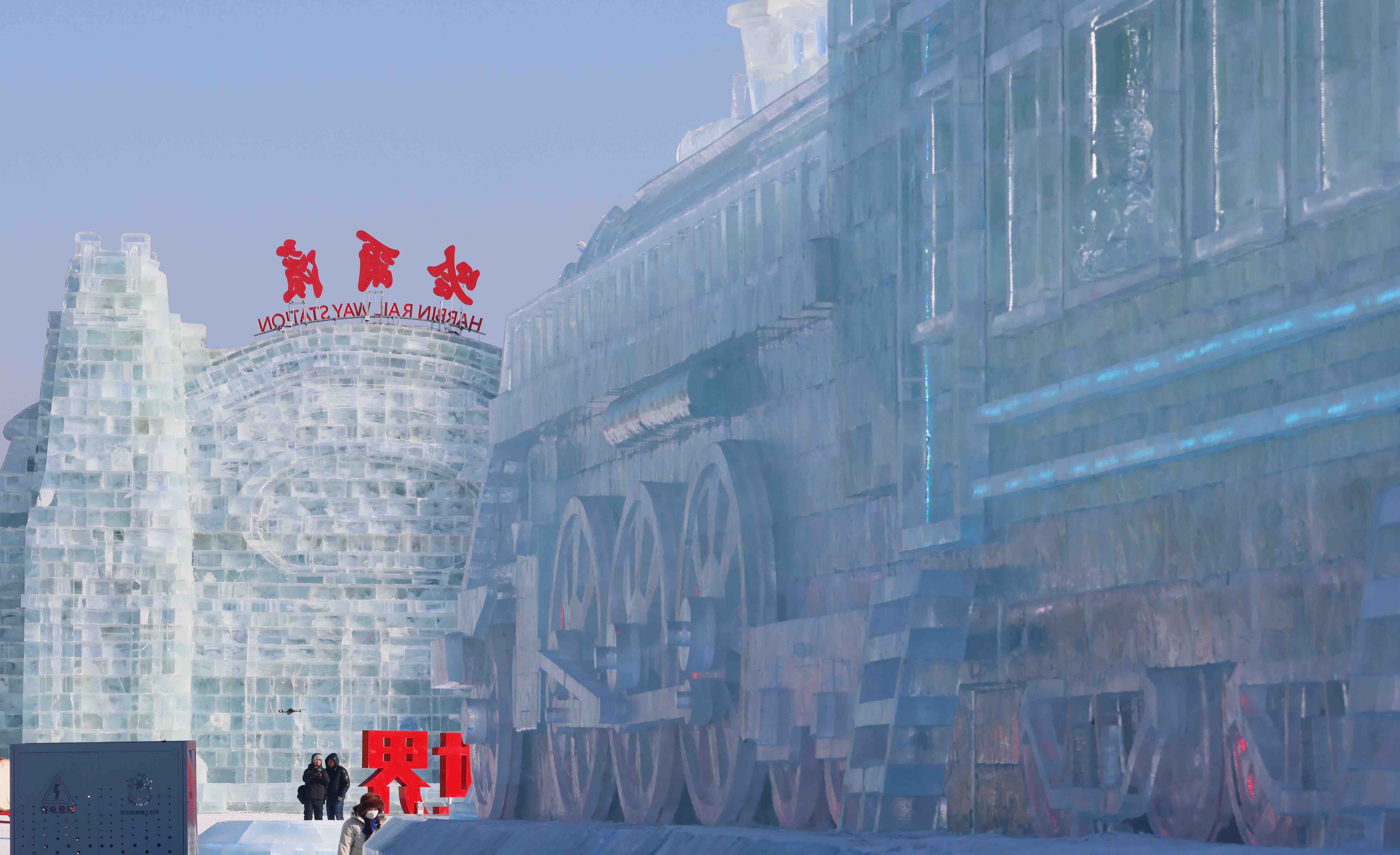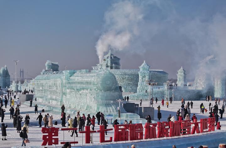 近日,在第二十七屆哈爾濱冰雪大世界入口,一輛以蒸汽機車為原型的“噴氣冰火車”成為冬日吸睛景觀。這輛火車旁邊,巧奪天工的冰雕師以百年老哈站為藍本,完美復刻了哈爾濱火車站。這個蒸汽機車造型逼真,車頭噴涌的霧氣升騰,仿佛列車即將緩緩駛入這座冰雪哈站,將游客瞬間拉回蒸汽機時代的浪漫場景。