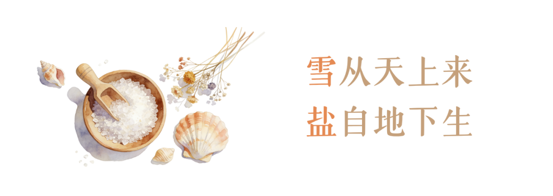 鹽與雪來歷不同。雪從天上來,而鹽來自地下。雪的成因與低沉的云氣有關,而鹽的提取有兩種途徑,其一是多年礦物質的沉積,其二便是海水的凝結。不論它們來自天上還是人間,其形成都有一個浪漫的過程。云與海水作為雪與鹽的載體,其氤氳與浩渺的氣質總令人浮想聯翩,誰能想到縹緲的云會幻化出那么輕盈、美麗、燦爛的雪花?誰能想到奔涌的海水會萃取出結晶的、閃著寶石一樣光澤的鹽粒?