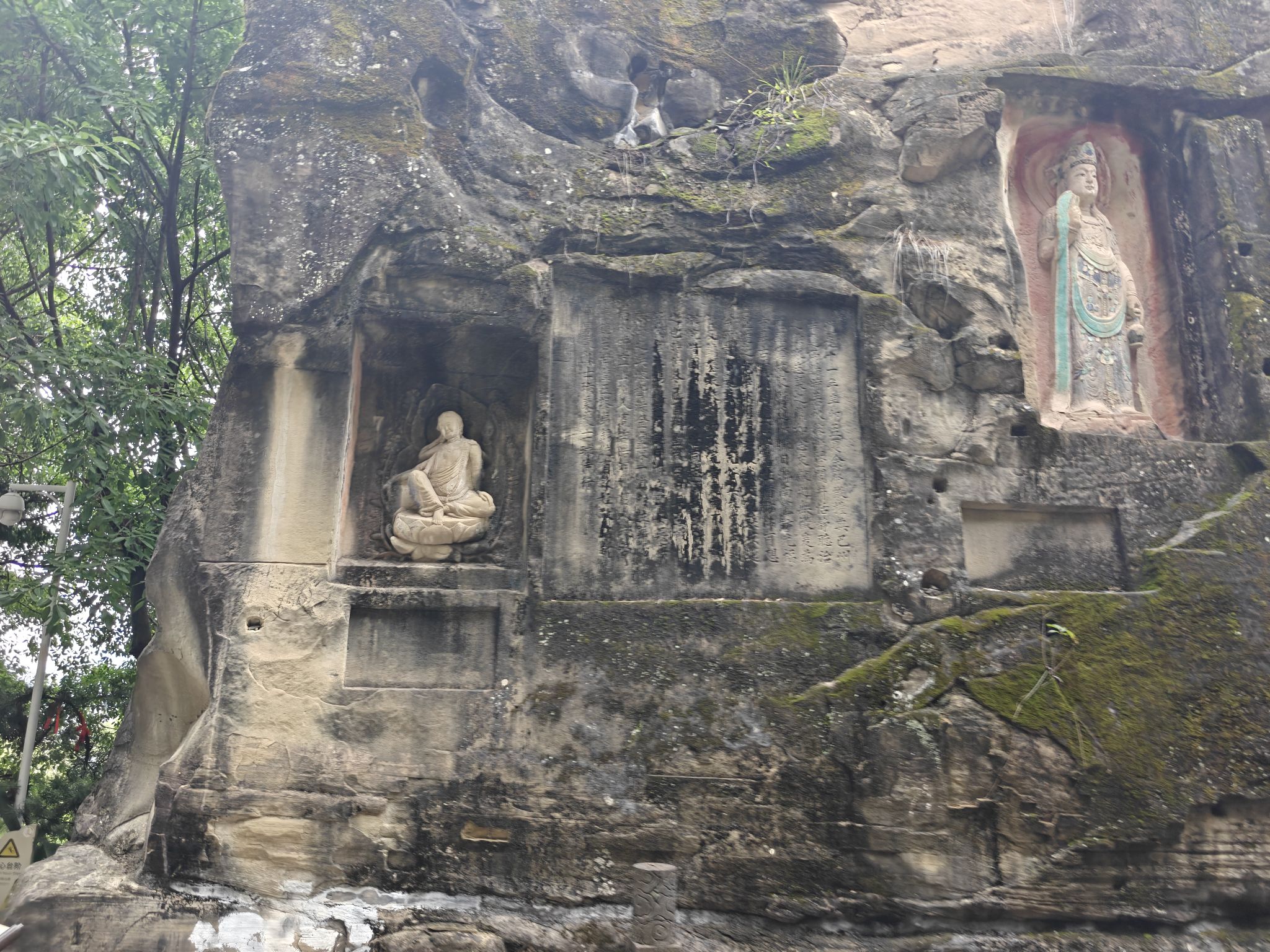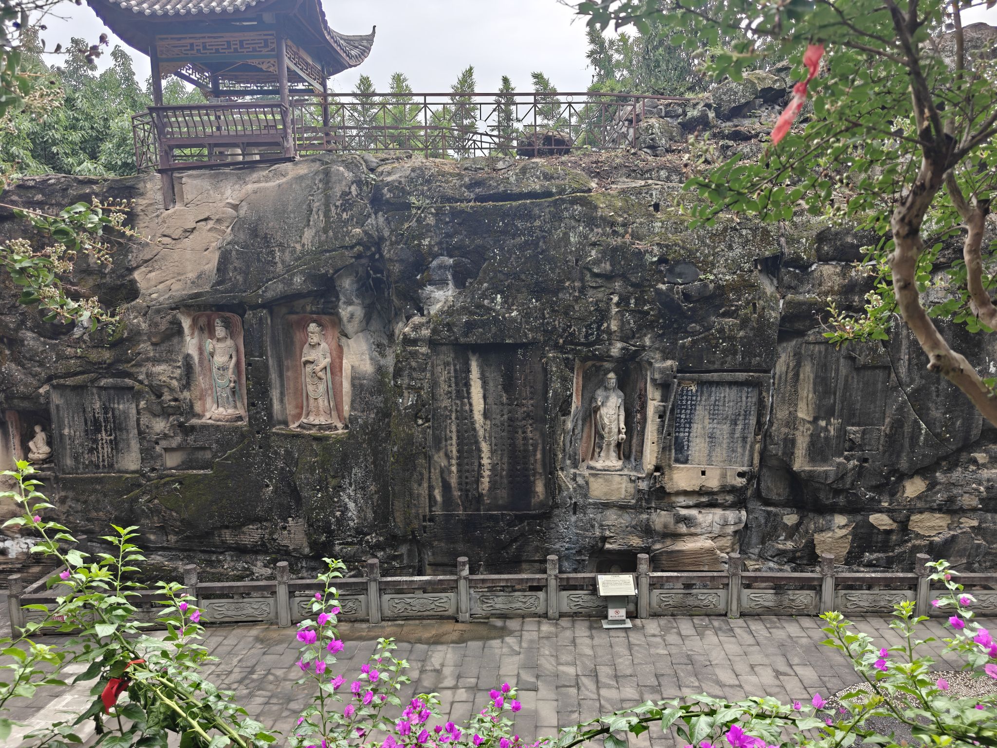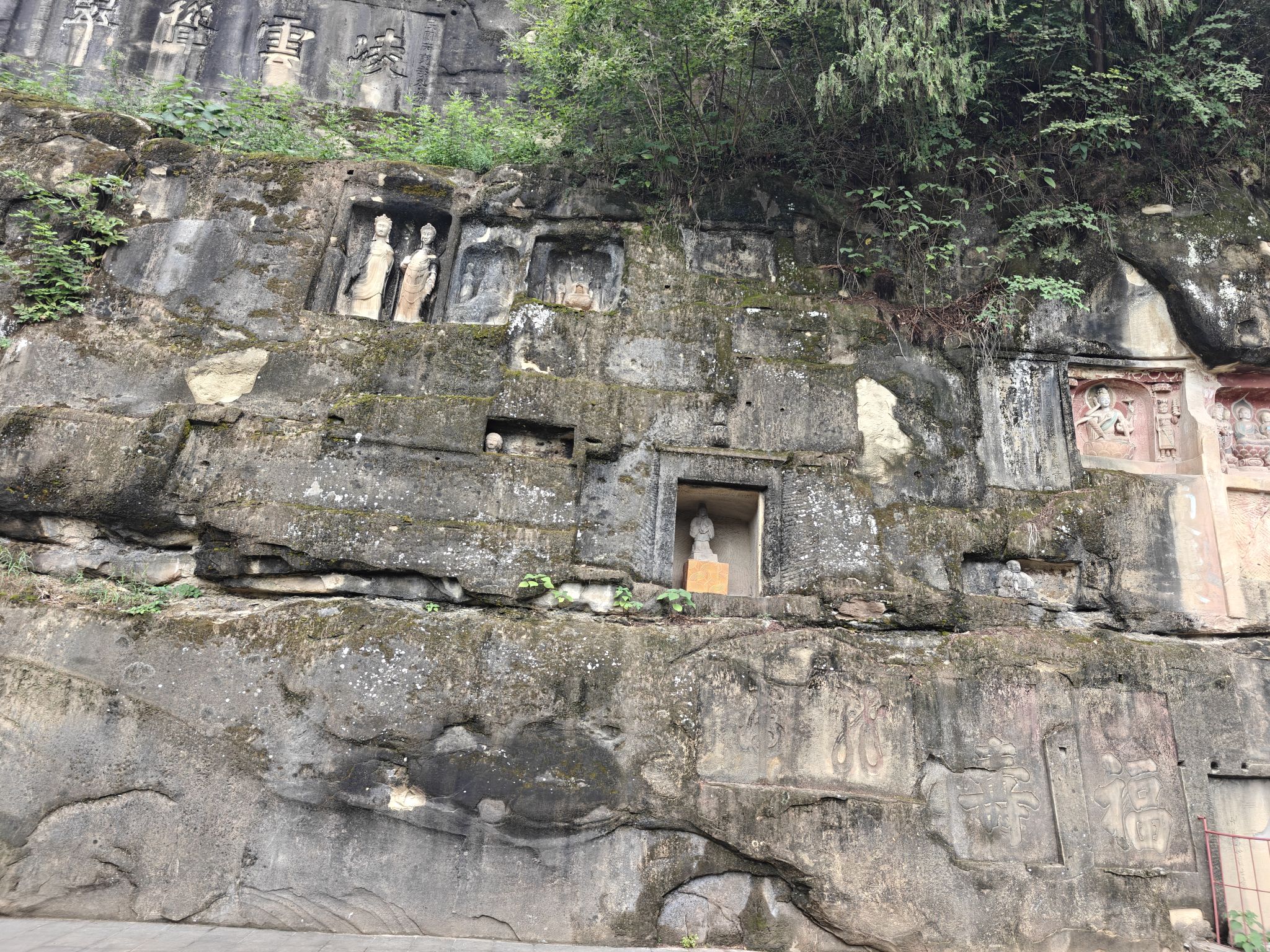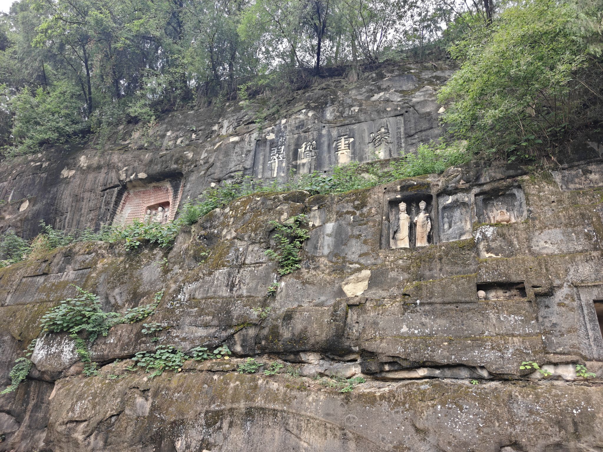 南龕摩崖石窟依山取勢,現(xiàn)存窟龕一百七十余座,佛像兩千余尊。這里的造像沒有北方石窟的粗獷雄渾,卻多了幾分蜀地的細(xì)膩溫潤。飛天衣帶如微風(fēng)拂過,菩薩低眉似在傾聽巴河千年的水聲。最為珍貴的是,崖壁間保存著嚴(yán)武、劉保等唐代官員的造像記與碑刻,墨跡斑駁間,記錄著八世紀(jì)中原與巴蜀的文化交融。