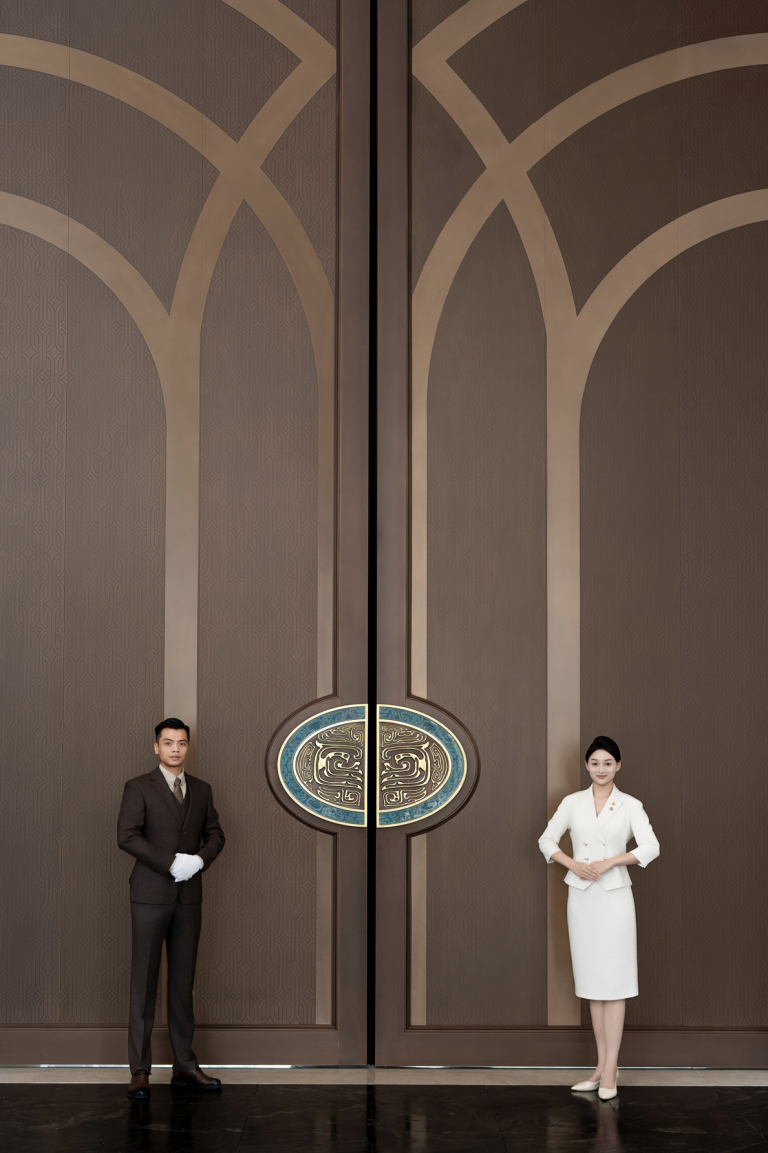 保利玥璽灣的歸家體驗被賦予了濃厚的儀式感與人文氣息。項目規(guī)劃三進歸家禮序:從蘊含“九五至尊”之意的9米高黑金奢石照壁,到代表吉祥的六棵百年紅果冬青。再到由國寶級非遺大師鍛造的鎏金銅門,每一步都融合了傳統(tǒng)文化與現(xiàn)代藝術,為塔尖人群重塑了頂序生活的風度與境界。