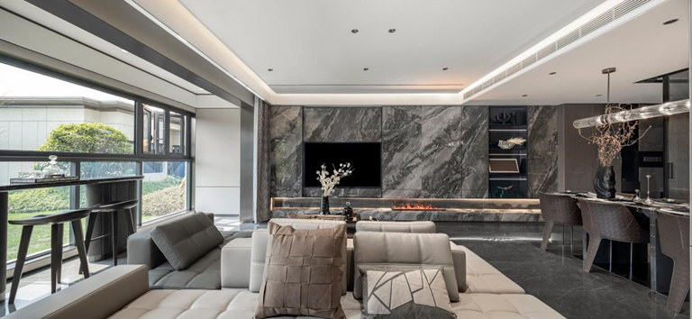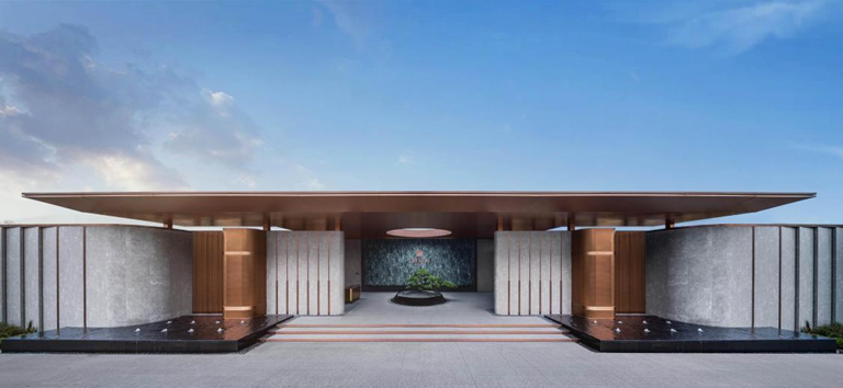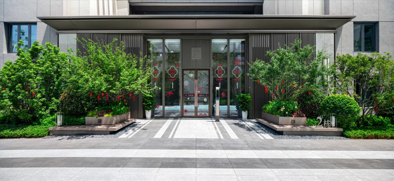 在美學層面,現代風格外立面以愛馬仕灰為主調,汲取傳統挑檐符號,塑造挺拔輪廓。景觀通過“一帶兩軸六園多院”的布局,融合人文與自然,酒店式主入口設計,歸家即是尊崇感的開始。
