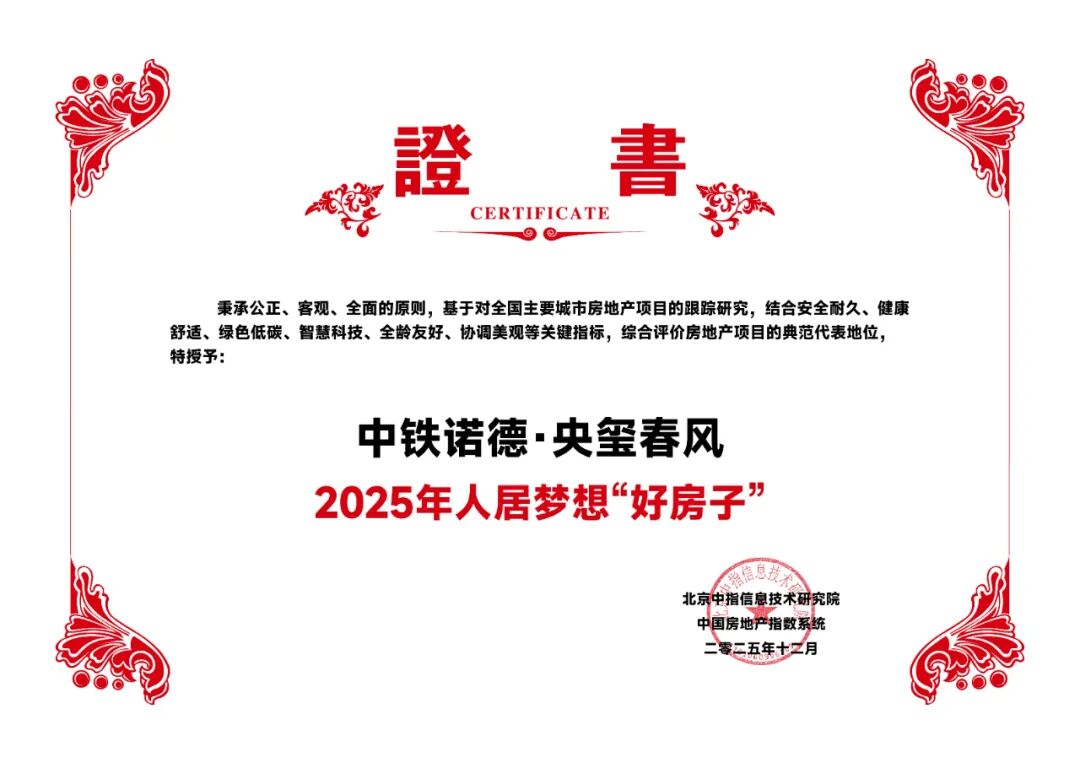 2025年12月11日,由北京中指信息技術研究院主辦,中國房地產指數系統和中國物業服務指數系統承辦的“2025中國房地產大數據年會暨2026中國房地產市場趨勢報告會”在北京召開。中鐵諾德·央璽春風憑借國央企的責任擔當與對品質的極致追求,榮獲了“2025年人居夢想“好房子””榮譽。