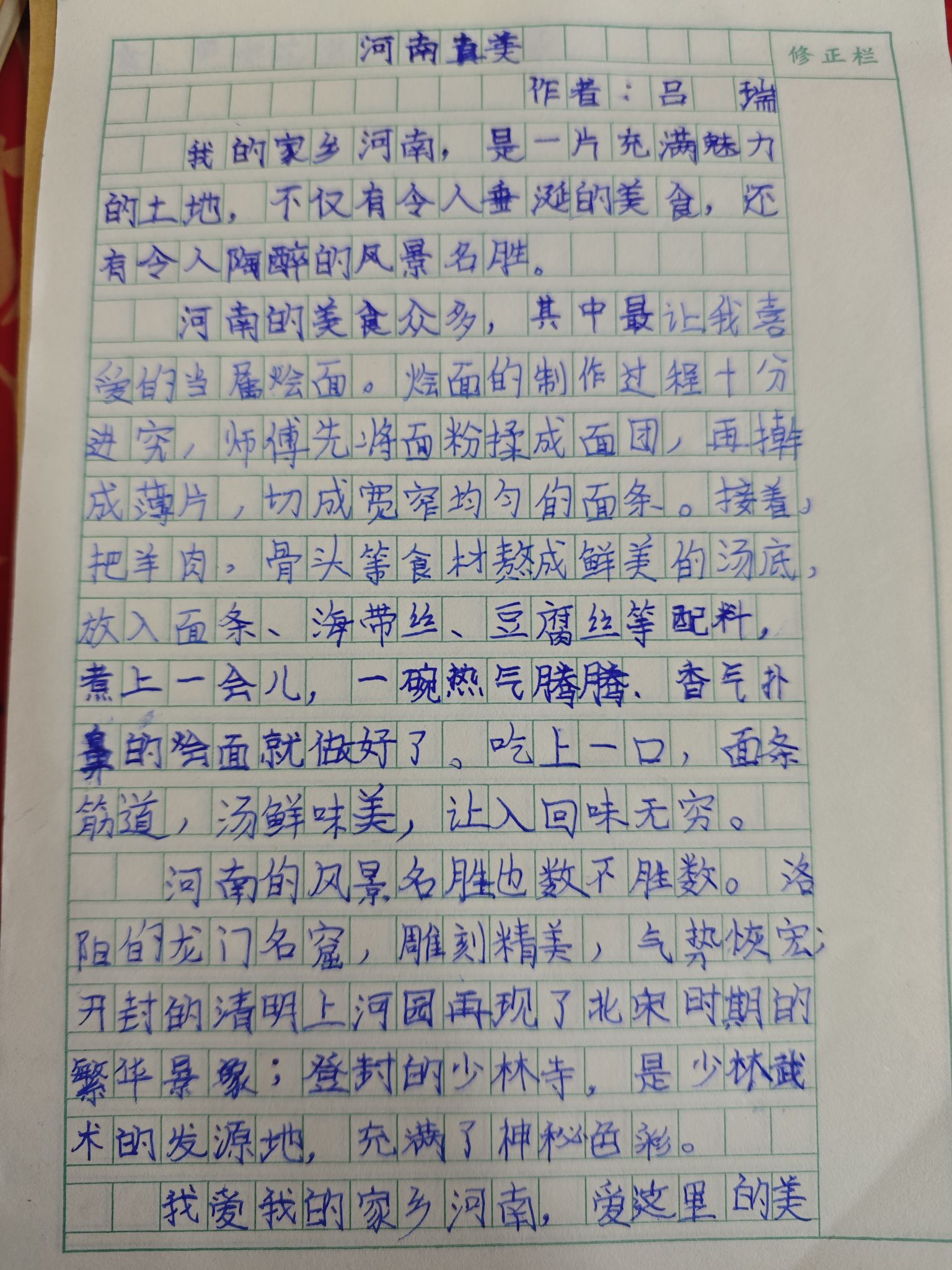 這篇《河南真美》緊扣主題,以“美食+風(fēng)景名勝”的結(jié)構(gòu)展現(xiàn)河南的魅力,選材典型且貼近家鄉(xiāng)特色。小作者對(duì)燴面的制作過(guò)程描寫得條理清晰,從揉面到熬湯再到成品,步驟完整且加入了味覺、嗅覺的體驗(yàn),讓美食描寫有畫面感;對(duì)龍門石窟、清明上河園、少林寺的介紹,精準(zhǔn)抓住了各景點(diǎn)的核心特點(diǎn),體現(xiàn)出對(duì)家鄉(xiāng)的了解與熱愛。文章結(jié)構(gòu)分明、情感真摯,若能修正字詞錯(cuò)誤并豐富細(xì)節(jié)描寫,會(huì)更具感染力。