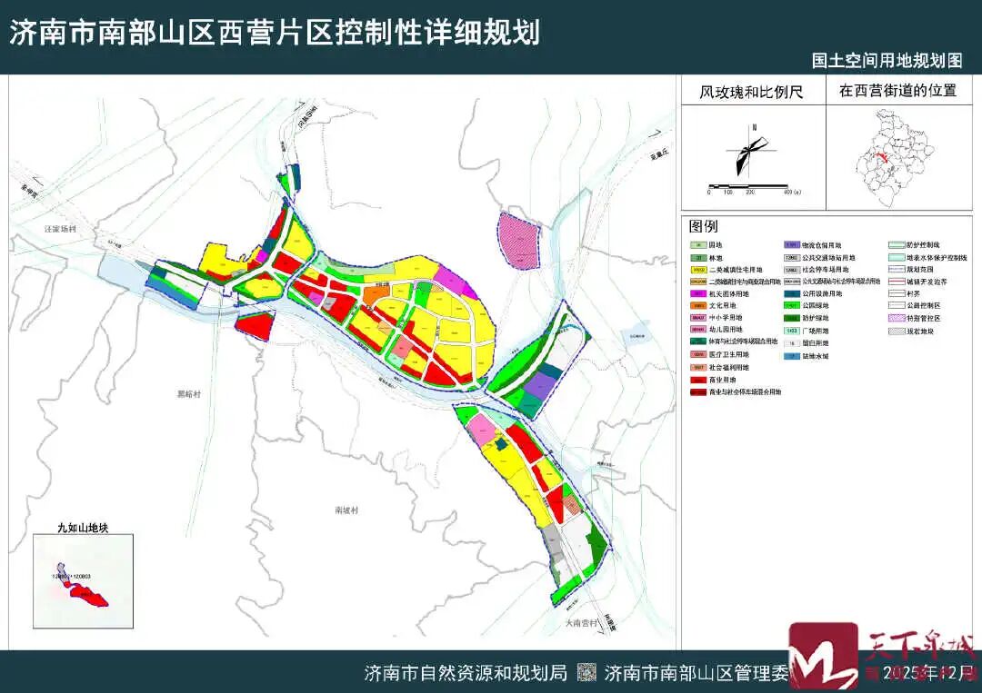 南部山區西營片區北至現狀街道辦事處、機關公寓、港西名苑地塊邊界,東至縣道051、南至錦繡川河道、西至西營村范圍開發邊界內用地以及外圍九如山地塊,規劃總用地面積約121.20公頃。