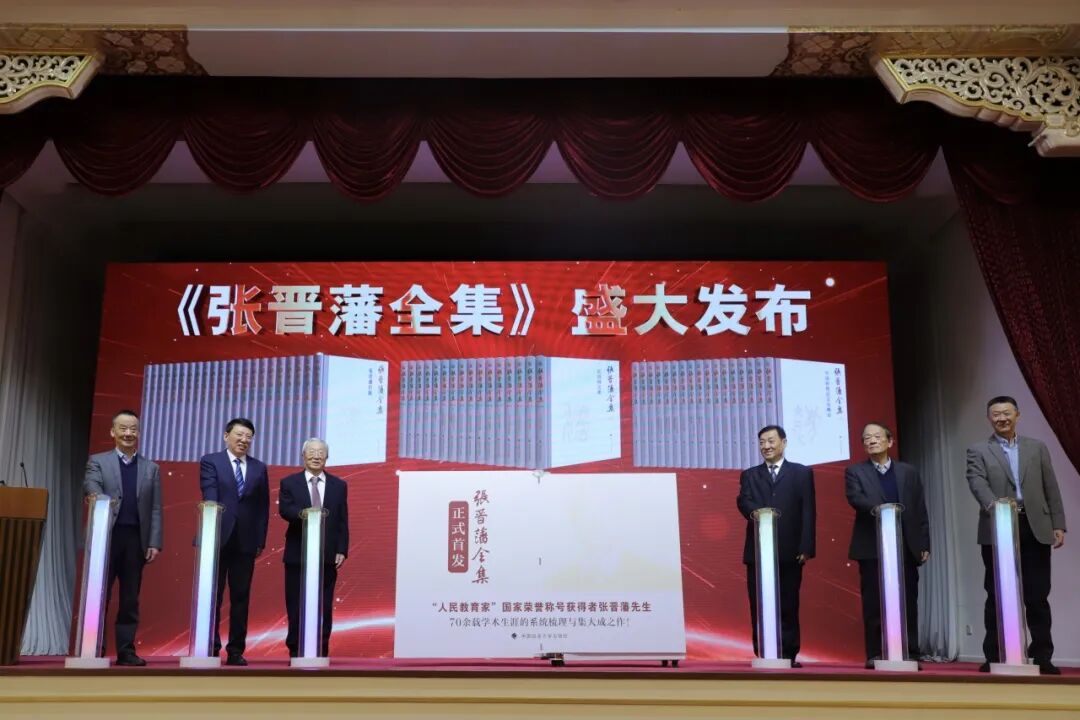《張晉藩全集》首發式由中國政法大學黨委副書記王立艷主持。張晉藩先生、牛青山主席、中國政法大學黨委書記姜澤廷、楊一凡研究員、朱勇教授、中國政法大學出版社社長尹樹東共同為首發式剪彩。
