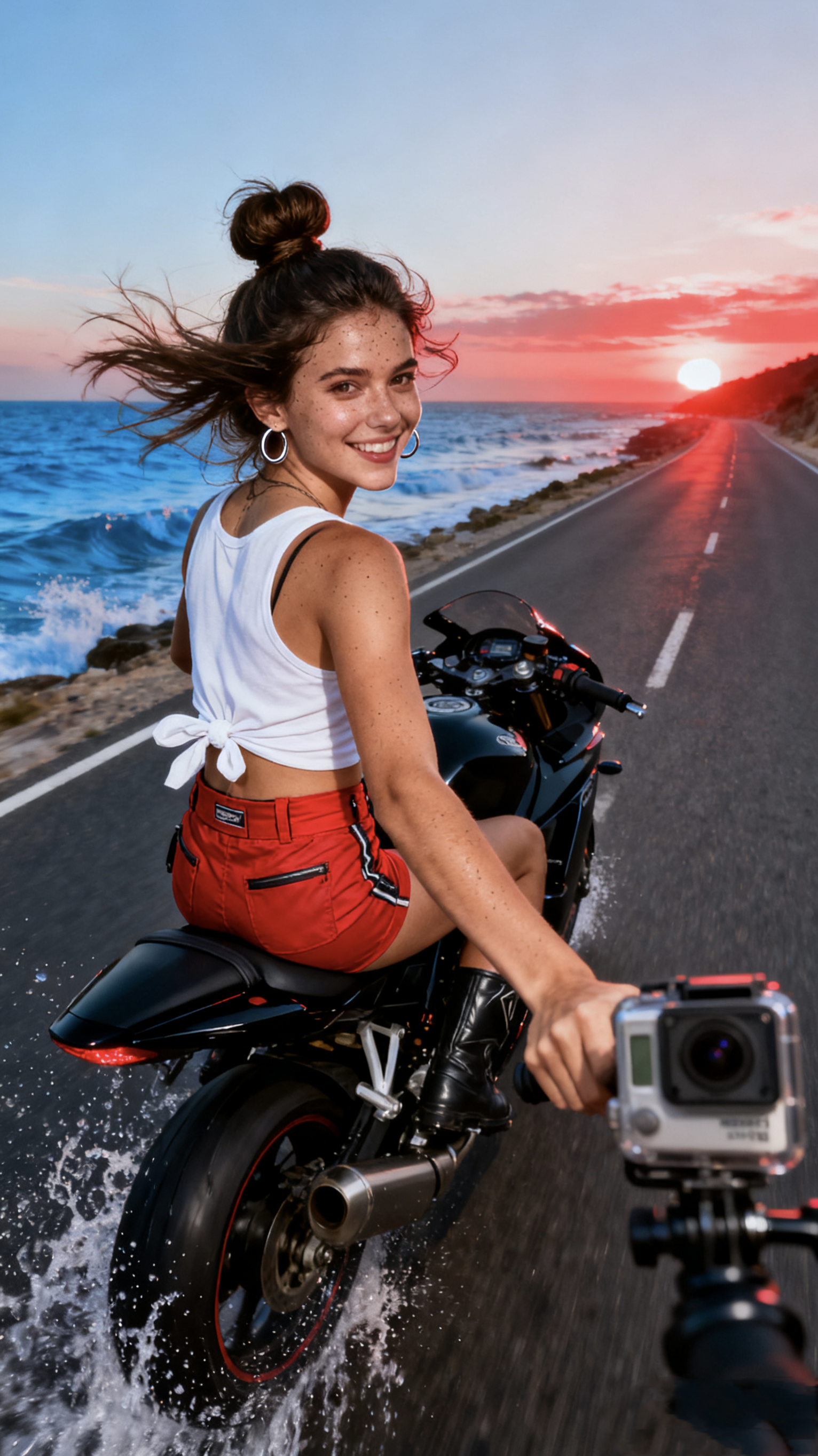我從車座旁的包里摸出早就準(zhǔn)備好的GoPro,把它架在車把前的支架上。鏡頭對著自己,也對著身后的落日與大海,我故意猛地擰動車把,讓車身側(cè)著劃過一道弧線,浪花在鏡頭里炸開成一片白霧,而我在畫面中央,笑得露出了牙齒。風(fēng)把頭發(fā)吹得更亂了,有幾縷粘在汗?jié)竦念~角,卻絲毫不在意,反而覺得這樣的凌亂,才是青春最真實的模樣。