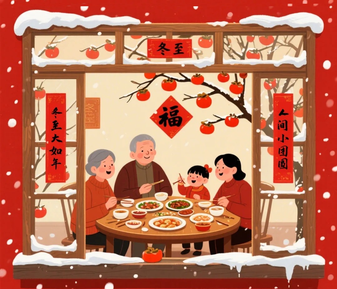 祭祀結束后,全家人圍坐在八仙桌旁,終于能享用這頓期盼已久的冬至宴。餃子煮得恰到好處,咬一口,湯汁鮮得眉毛都要掉下來;八道菜各有風味,每一口都是熟悉的家的味道。大人們聊著家常,說著來年的打算,我則只顧著埋頭吃餃子,奶奶坐在一旁,不停給我夾菜,眼神里滿是寵溺。窗外寒風呼嘯,屋內卻暖意融融,燈火在每個人的臉上跳躍,定格成最溫暖的畫面。那時的我不懂,這看似尋常的團圓,竟是生命中最珍貴的饋贈;這代代相傳的習俗,竟是連接過去與未來的紐帶。