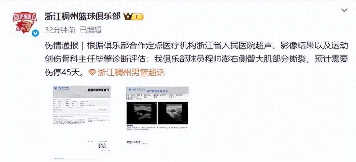12月19日深夜,浙江稠州男籃官方發布的一則消息瞬間引爆籃球圈——程帥澎右側臀大肌部分撕裂,需要休戰45天。 這位在不久前對陣韓國隊時砍下全隊最高19分的后衛,恰好在中國男籃備戰2月26日與日本隊世預賽的關鍵時刻倒下。