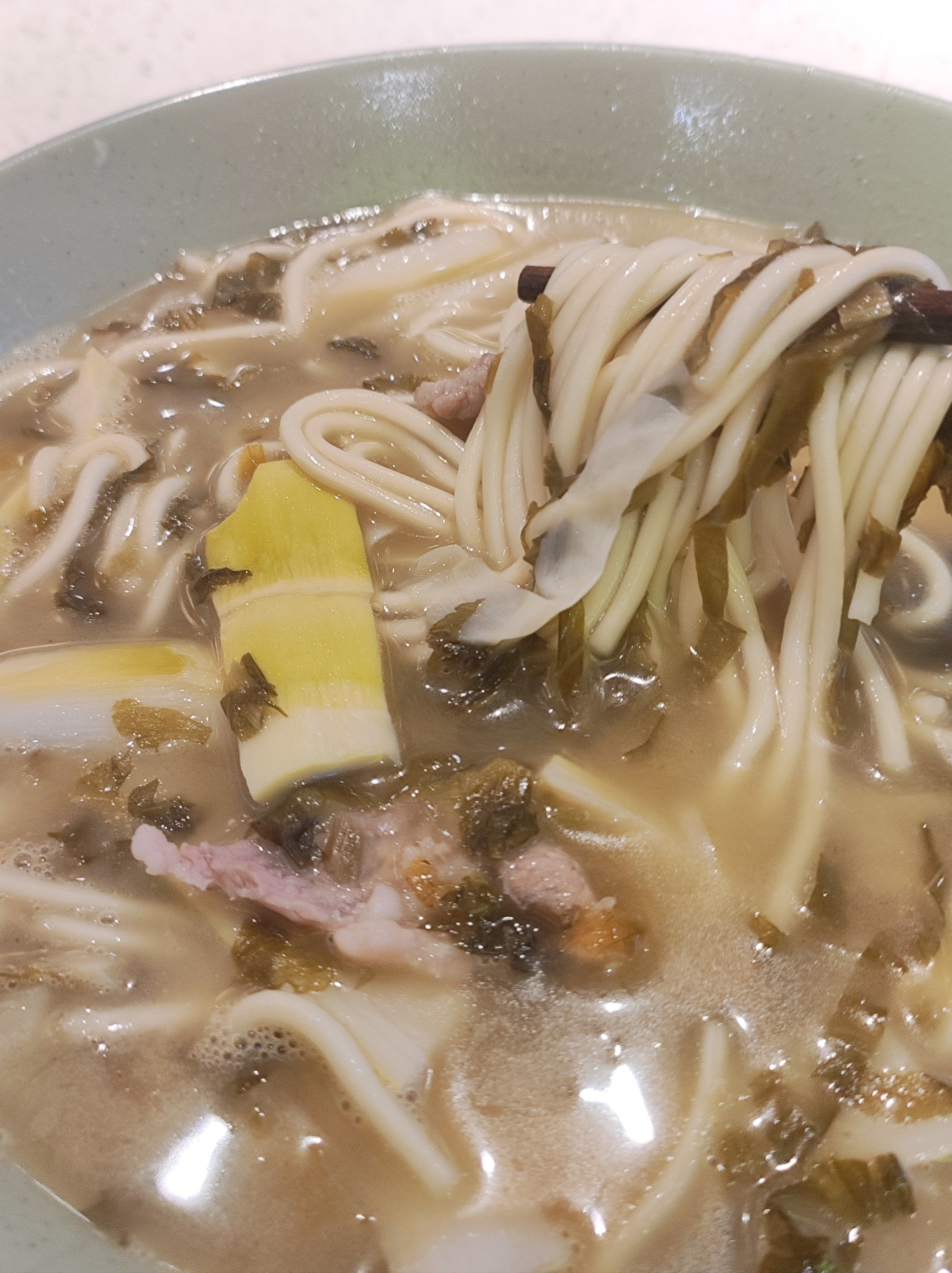 雪菜脆、筍片嫩、肉絲鮮,配手工堿水面,湯頭用豬骨雞架熬制,鮮而不濁。