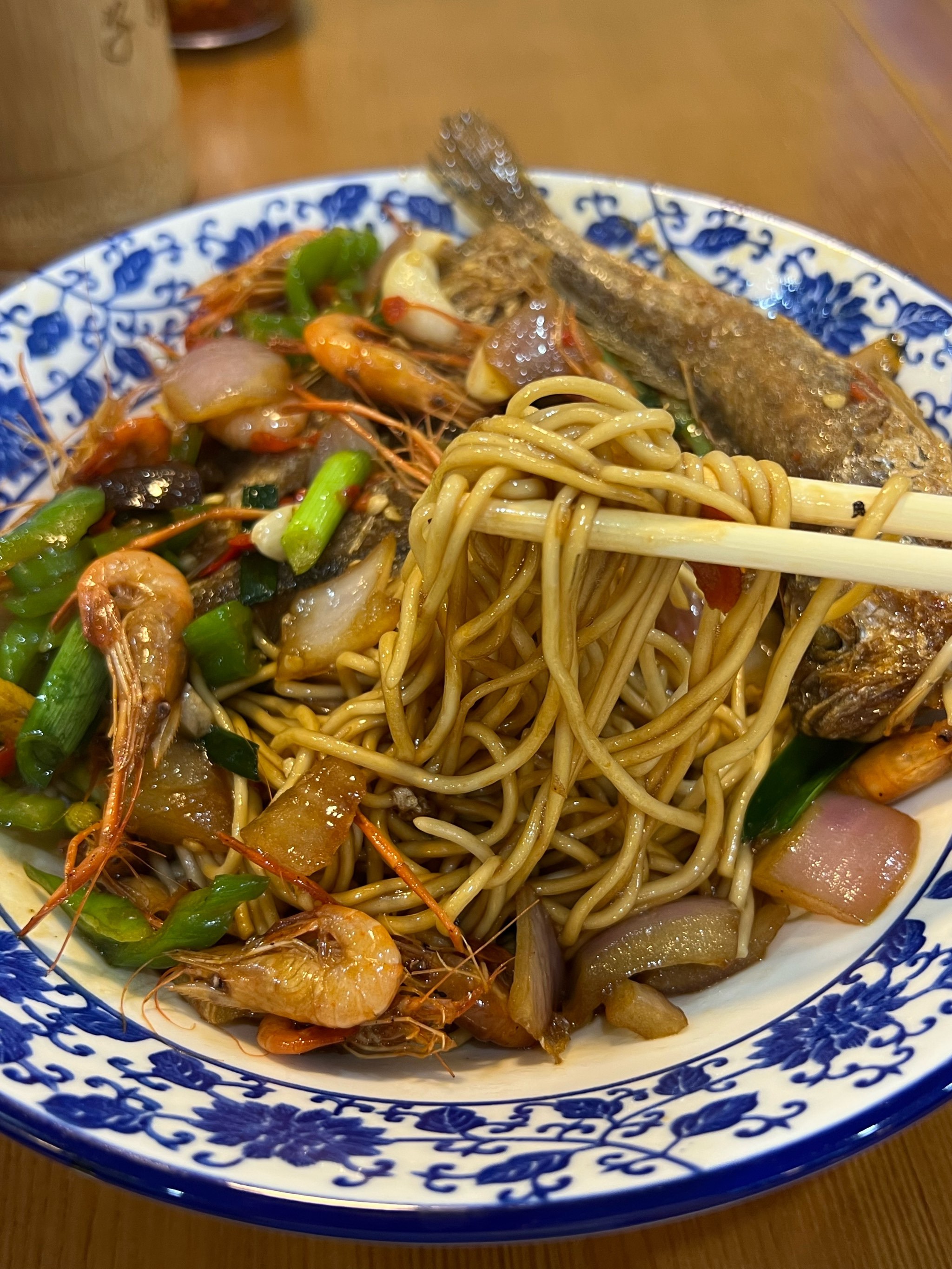 酥肉爆魚雙澆頭,魚香肉香纏得緊,三口下肚,力氣比蠶寶寶吐絲還足。