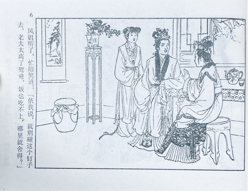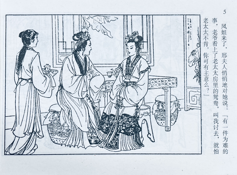 5、鳳姐來了,邢夫人悄悄地對她說:「有一件為難的事,老爺看上了老太太房里的鴛鴦,叫我討去,就怕老太太不肯,你可有主意么?」