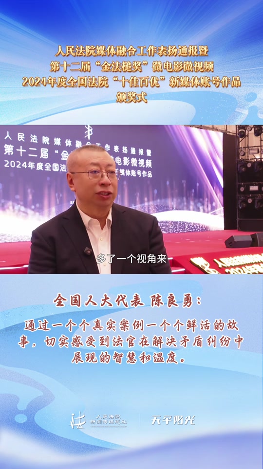 【全國人大代表陳良勇:通過一個個真實案例一個個鮮活的故事,切實感受到法官在解決矛盾糾紛中展現的智慧和溫度】2025年12月17日,人民法院媒體融合工作表揚通報暨第十二屆“金法槌獎”微電影微視頻、2024年度全國法院“十佳百優”新媒體賬號作品頒獎式在哈爾濱舉行。全國人大代表、哈爾濱瀚霖科技開發有限公司董事長陳良勇受邀作為嘉賓出席活動。 陳良勇表示,通過舉辦這樣的征集評選活動,讓他們多了一種視角來了