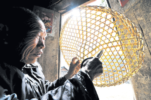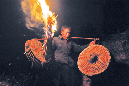 他捕捉“黎明”微光。2014年清明節(jié),白桑關鎮(zhèn)一條崎嶇山路上,晨光刺破火把的柔光,斗笠匠羅高太挑著斗笠走鄉(xiāng)串戶,竹篾在熹微中泛著青芒,老人佝僂的脊背與巍巍青山疊印成圖騰。吳成林俯身于露水叢中,迅速按下相機快門,用鏡頭記錄下這質樸而珍貴的畫面——《山村斗笠匠》,讓斗笠匠的故事傳向遠方。