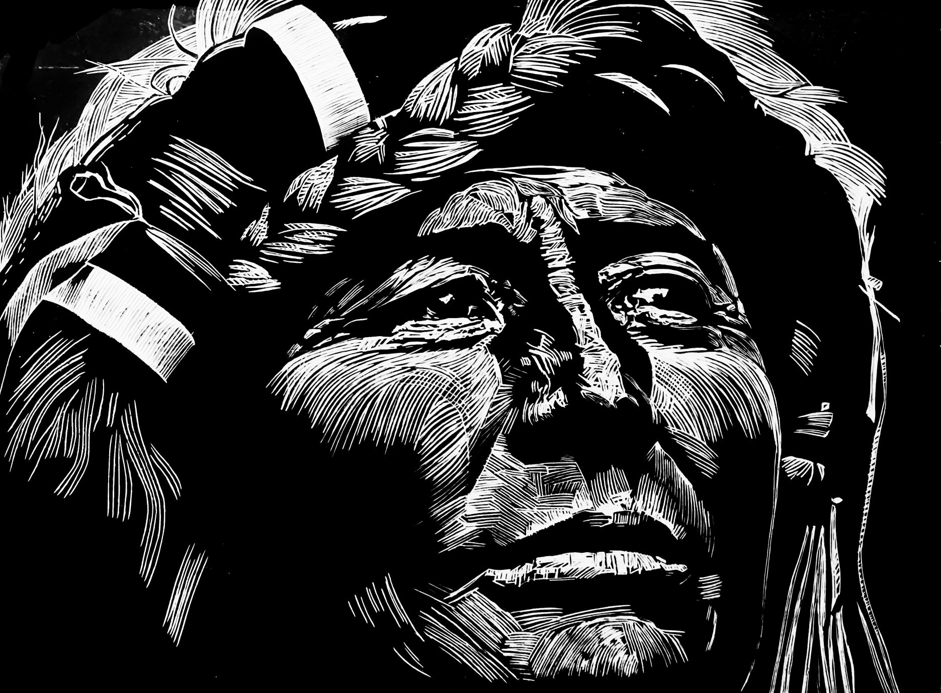 這張臉,就是一片沉默的高地。羽冠如嶙峋的峰巒,刺向蒼穹;皺紋是大地的溝壑,刻滿風(fēng)的語(yǔ)言與日光的年輪。在黑白分明的世界里,他的仰望,是投向虛空最深沉的一問(wèn)。