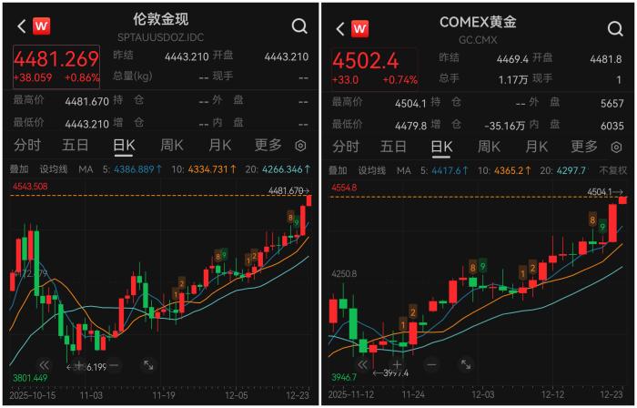 中新網12月23日電(記者 張乃月)北京時間12月23日,國際金價亞洲早盤時段上漲,創下歷史新高,COMEX黃金期貨一度突破4500美元/盎司,現貨黃金突破4480美元/盎司。