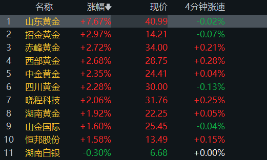 二級市場上,貴金屬板塊也同步走強,其中,山東黃金漲超7%,招金黃金、赤峰黃金、中金黃金、西部黃金跟漲。