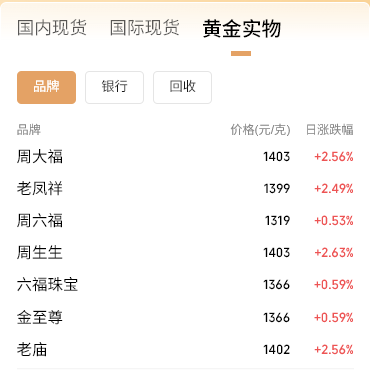 部分黃金飾品品牌價格同步上漲,周大福、周生生、老廟等品牌黃金飾品價格已超過1400元/克,老鳳祥、六福珠寶等也已逼近這一價格。
