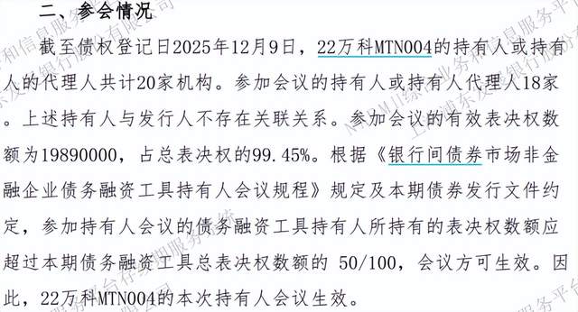 會議參與度極高,債權登記日共計20家機構持有人,18家出席會議,有效表決權占比高達99.45%。在這種高參與度下,三項議案均未能達到90%的生效門檻,凸顯了債權人對萬科所提方案的整體不滿意。