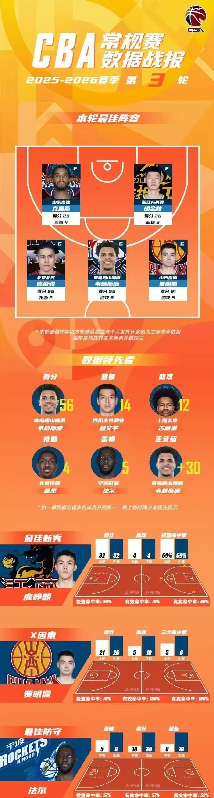 CBA官宣常規賽第3輪最佳陣容,青島外援韋瑟斯龐不到25分鐘狂轟56+6+6,貢獻本賽季CBA最強單場表現領銜入選,陳盈駿26分連續兩輪入選,胡金秋26+9、賈明儒21+5與克里斯29分也上榜。