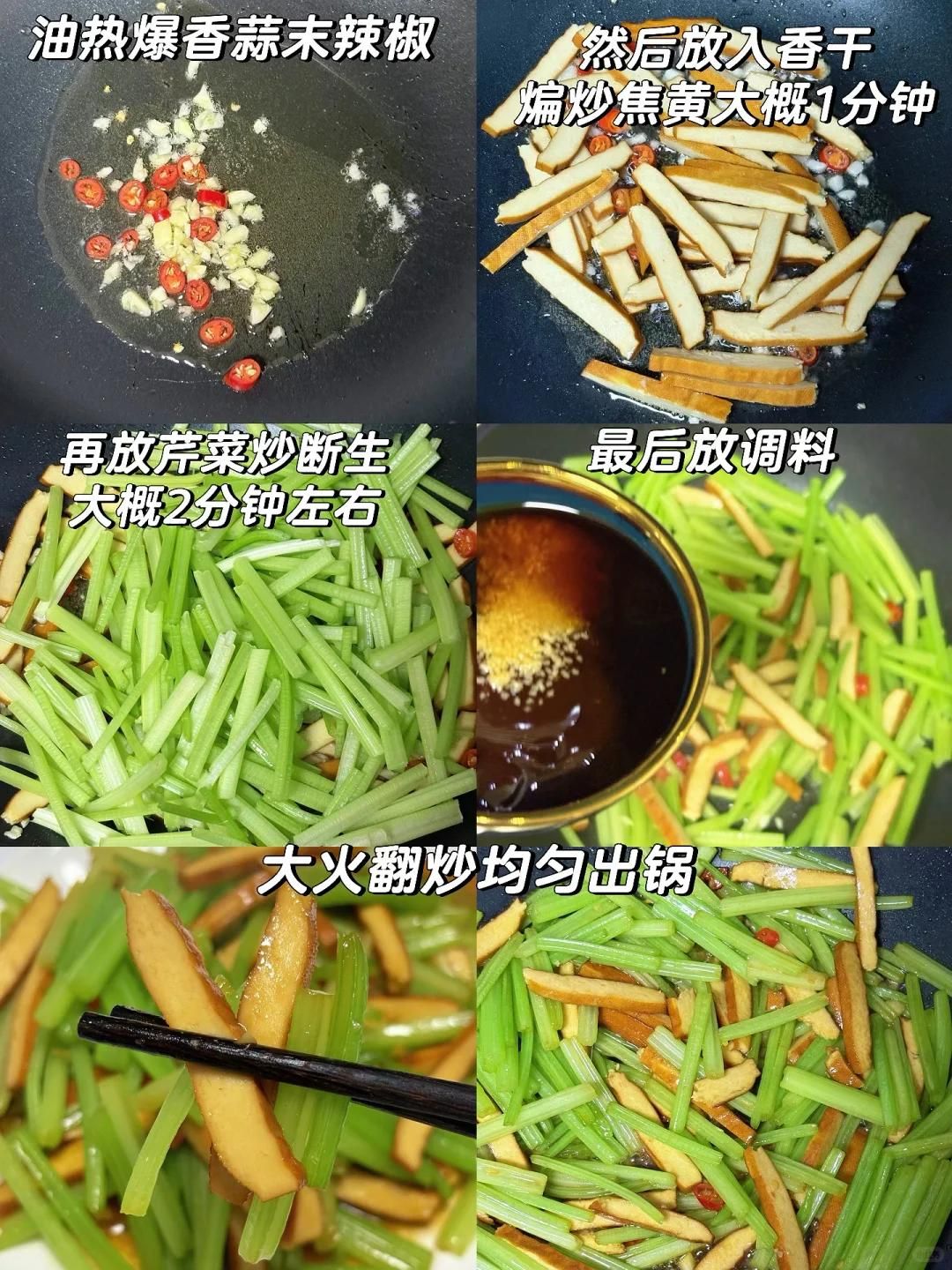 鍋里倒油,放蒜末、小米辣炒香,再放入香干翻炒幾下,加一勺生抽調味,接著放入芹菜段大火快速翻炒。