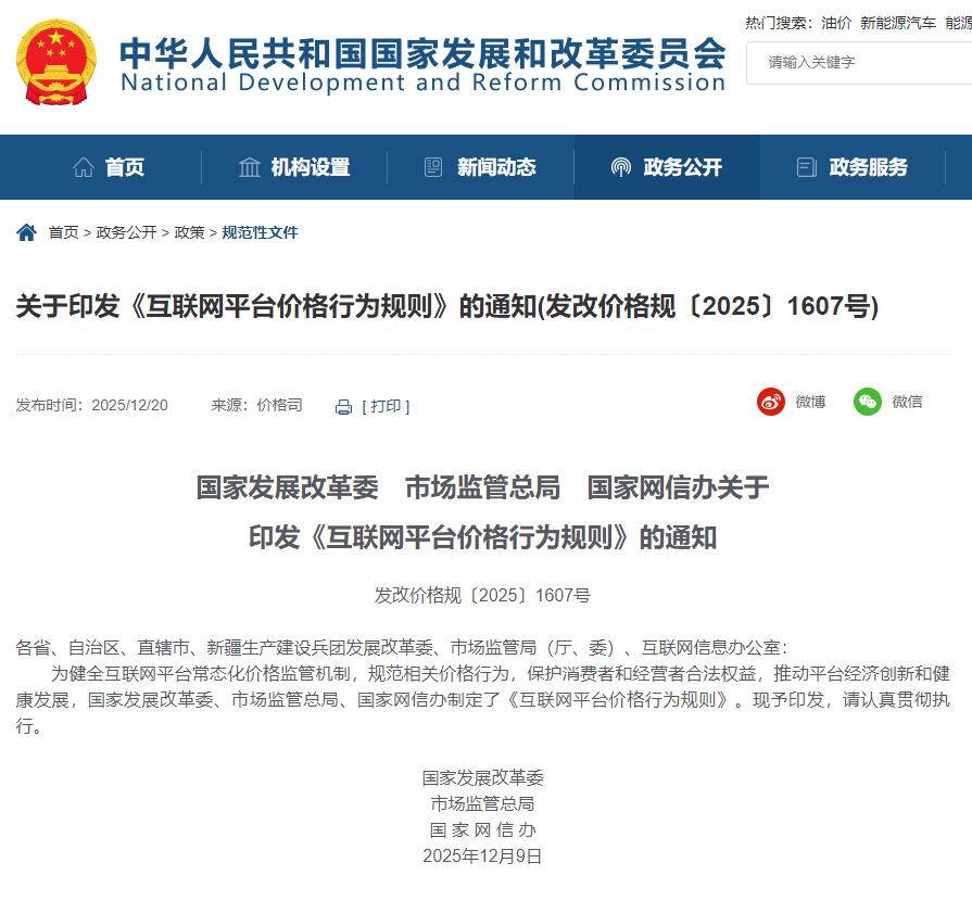 據國家發展改革委網站20日消息,為深入貫徹落實黨的二十大和二十屆歷次全會精神,推動平臺經濟創新和健康發展,近日,國家發展改革委、市場監管總局、國家網信辦聯合發布《互聯網平臺價格行為規則》(以下簡稱《行為規則》)。