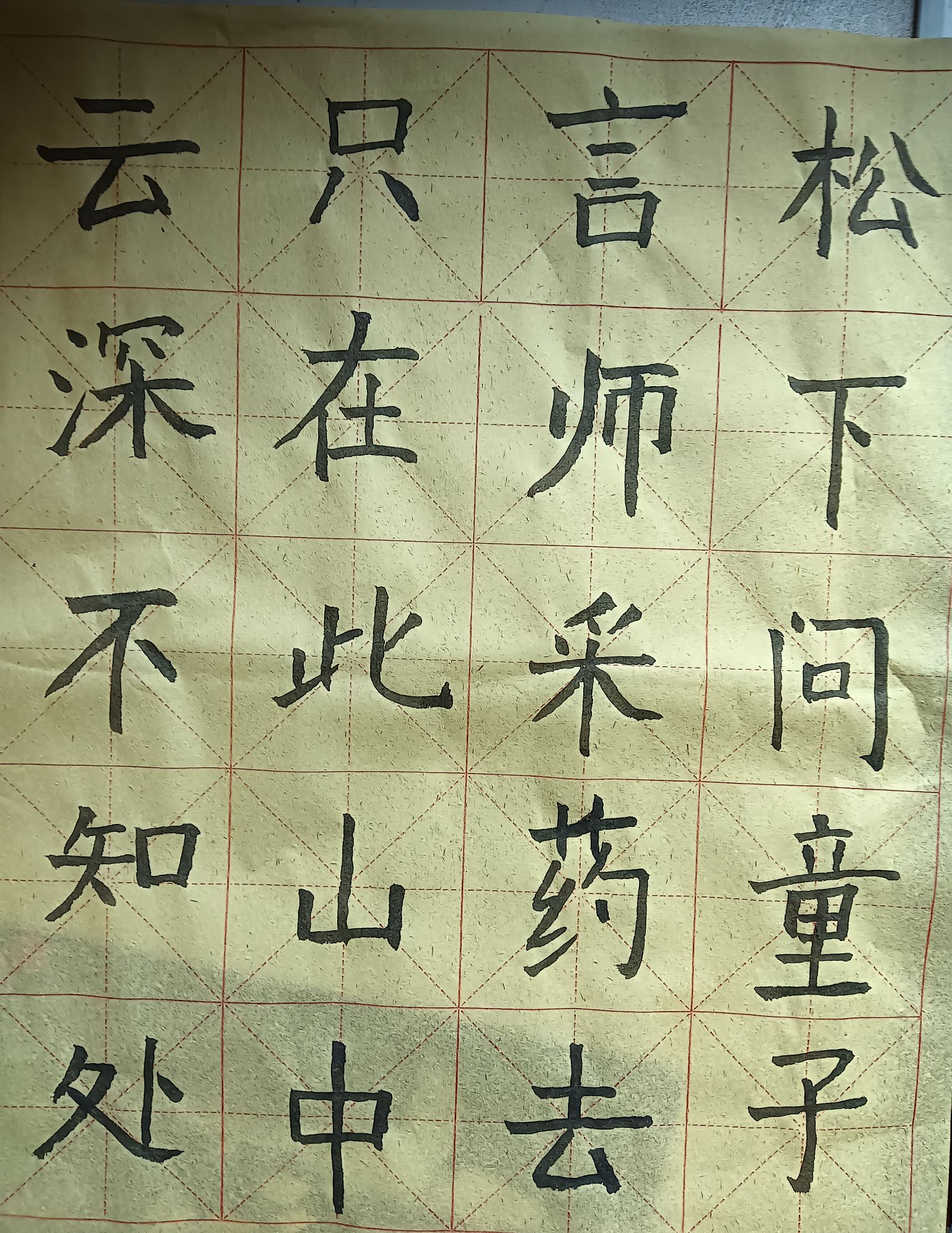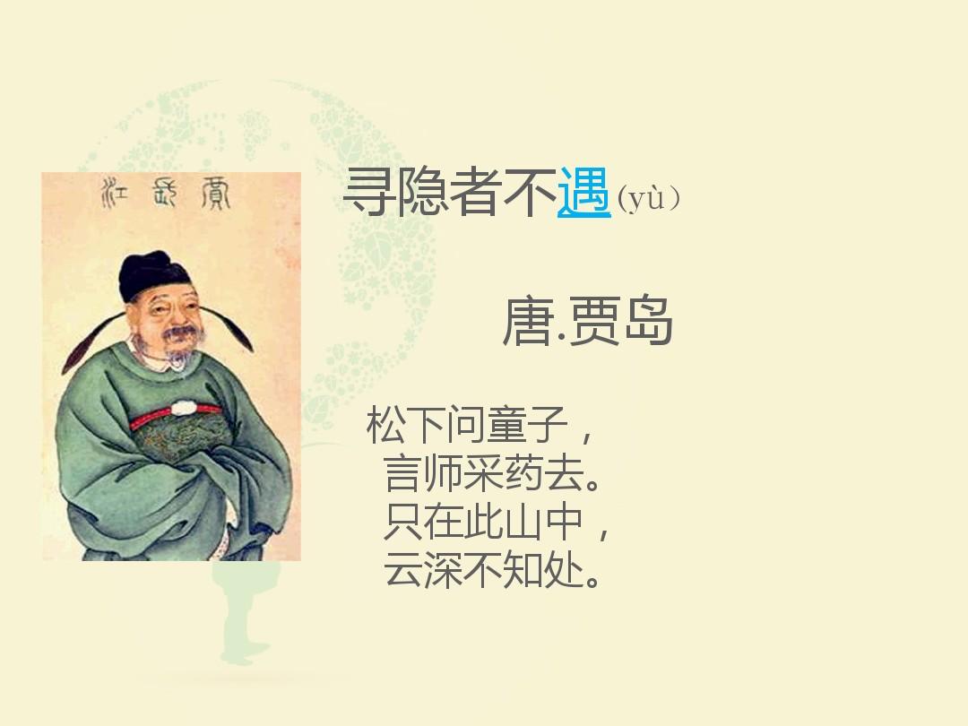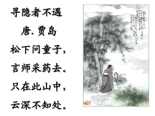 詩人來拜訪他的老朋友,在松樹下向隱者的小徒弟打聽隱者的去向。小徒弟告知師父采藥去了。就在山中,但因云霧彌漫,不知其確切位置。