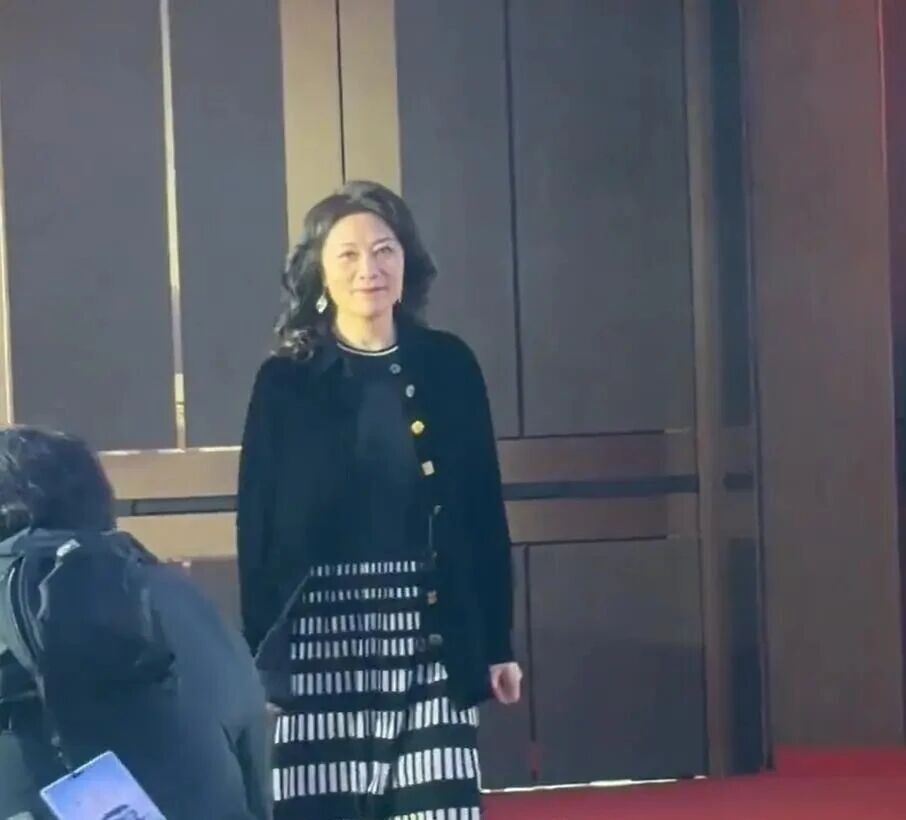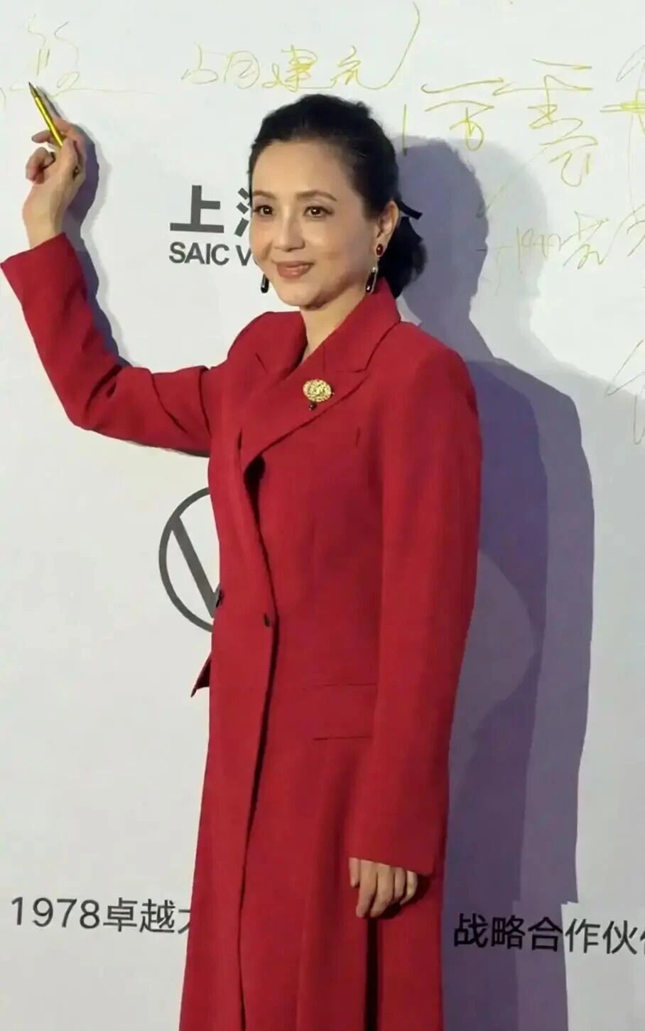 她未改發型,未曾染發,亦未著露背長裙。一襲紅色毛呢大衣,及膝而止,并非拖地款式;黑色高跟鞋,鞋跟穩健,絕無尖銳刺人之感;發髻盤得利落,宛如剛演繹完《紅樓夢》的黛玉,清雅脫俗。