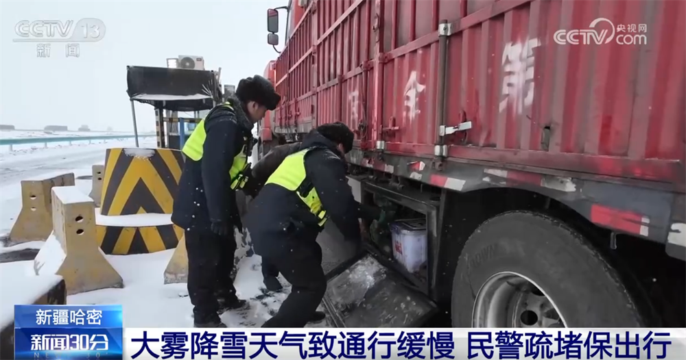 新疆哈密:大霧降雪天氣致通行緩慢 民警疏堵保出行