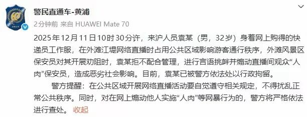 2025年12月11日10時30分許,網民袁某(男,32歲)身著網上購得的快遞員工作服,在上海外灘江堤網絡直播時占用公共區域影響游客通行秩序,外灘風景區保安員對其開展勸阻時,袁某拒不配合管理,進行言語挑釁并煽動直播間觀眾“人肉”保安員,造成惡劣社會影響。