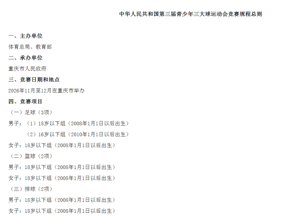 記者從國家體育總局青少司獲悉,將于明年11月至12月在重慶舉行的第三屆全國青少年三大球運動會增設(shè)男足U16組。 ??圖片來自國家體育總局官網(wǎng) 國家體育總局官網(wǎng)日前公布了關(guān)于舉辦該賽事的通知,確認(rèn)這屆比賽將于2026年11月至12月在重慶舉行。其中,足球設(shè)男、女子18歲以下和男子16歲以下3個組別,而籃球和排球仍分別設(shè)男、女子18歲以下組這兩個組別。各小項比賽成績將帶入第十六屆全運會的總成績冊中。 國家體育總局青少司負(fù)責(zé)人表示,最近一個時期各地的體育部門對足球青訓(xùn)工作越來越重視,業(yè)內(nèi)有較高的增項呼聲。此外,現(xiàn)在U17亞洲杯和世界杯都是每年舉行一次。增設(shè)U16這個組別,也是為了幫助U17男足國家隊更好地選拔人才、做好U17年齡段亞洲杯和世界杯的備戰(zhàn)工作。 首屆全國青少年三大球運動會于2024年11月在湖南省長沙市和岳陽市舉行,第二屆賽事與今年的第十五屆全運會合并舉行。 青少司負(fù)責(zé)人表示,目前足、籃、排球每年都各自舉辦全國范圍的青少年賽事。全國青少年三大球運動會放在年底舉行,形成了一個年度的完整賽歷。