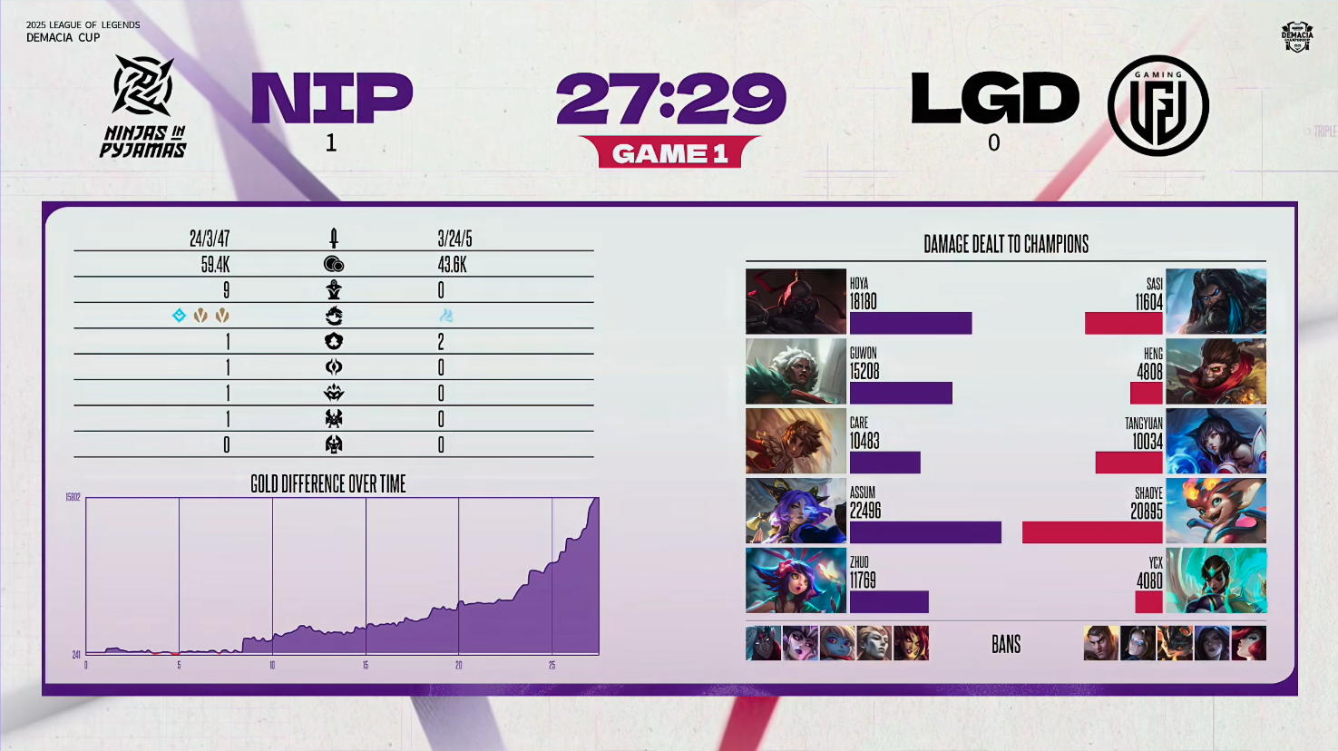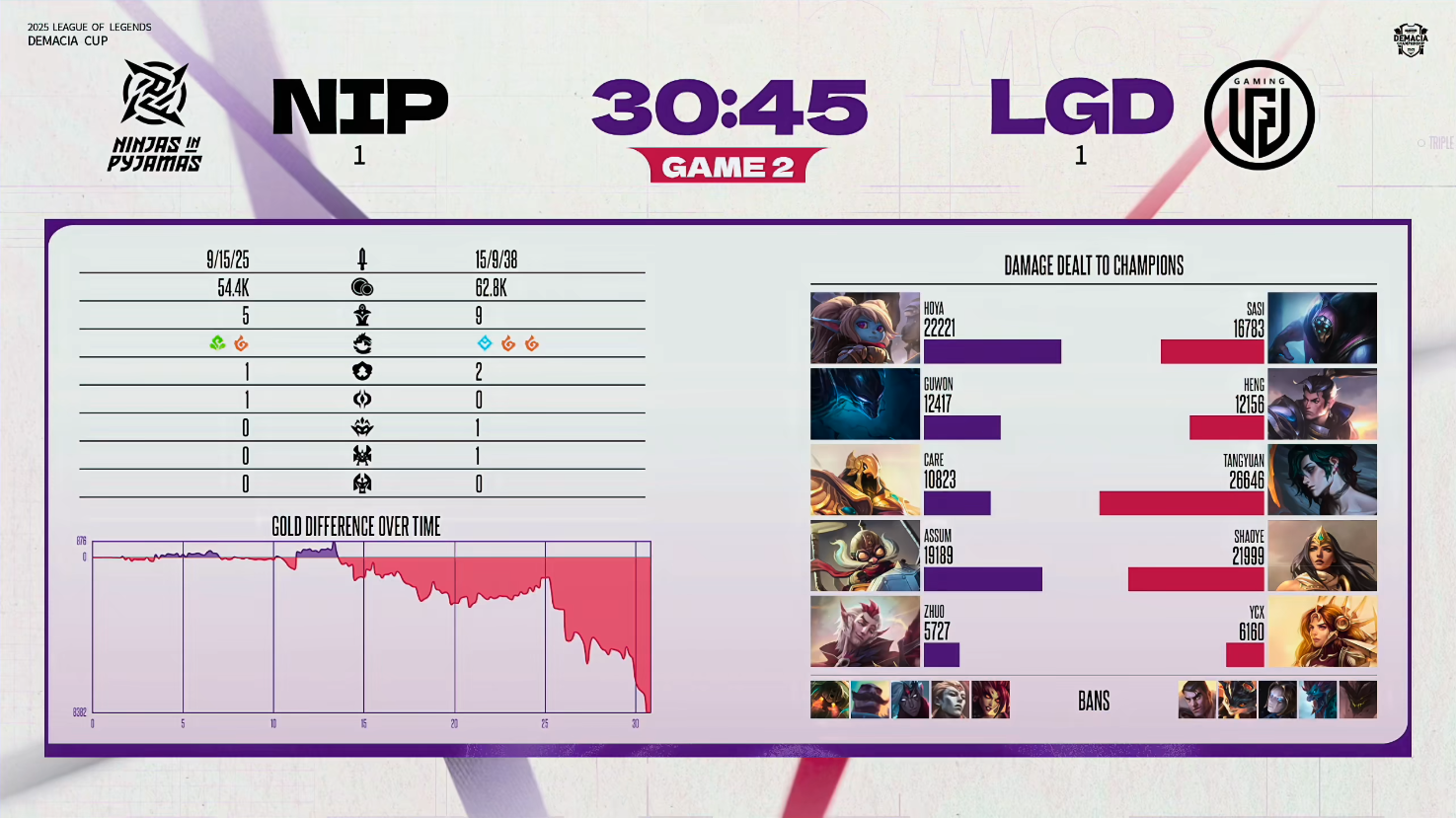 結果第一局比賽,被NIP打成了單方面的碾壓局。前10分鐘,雙方打得比較謹慎,經濟一直無法拉開。14分鐘左右,Zhuo妮蔻化身小兵隨后大招開團擊殺sasi;18分鐘左右,HOYA塞恩控制拉滿,NIP團戰輕松平推隨后拿下小龍;22分鐘左右,NIP打出1換4團戰,隨后拿下聽牌小龍;25分鐘左右,Assum極限鎖血拿下三殺,NIP拿下大龍;最終27分29秒,NIP團滅LGD,先贏一局。