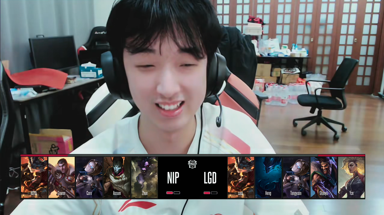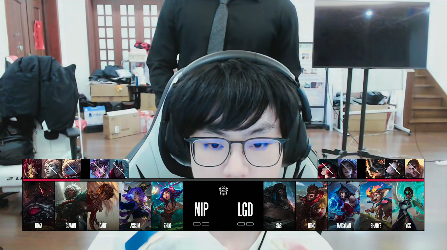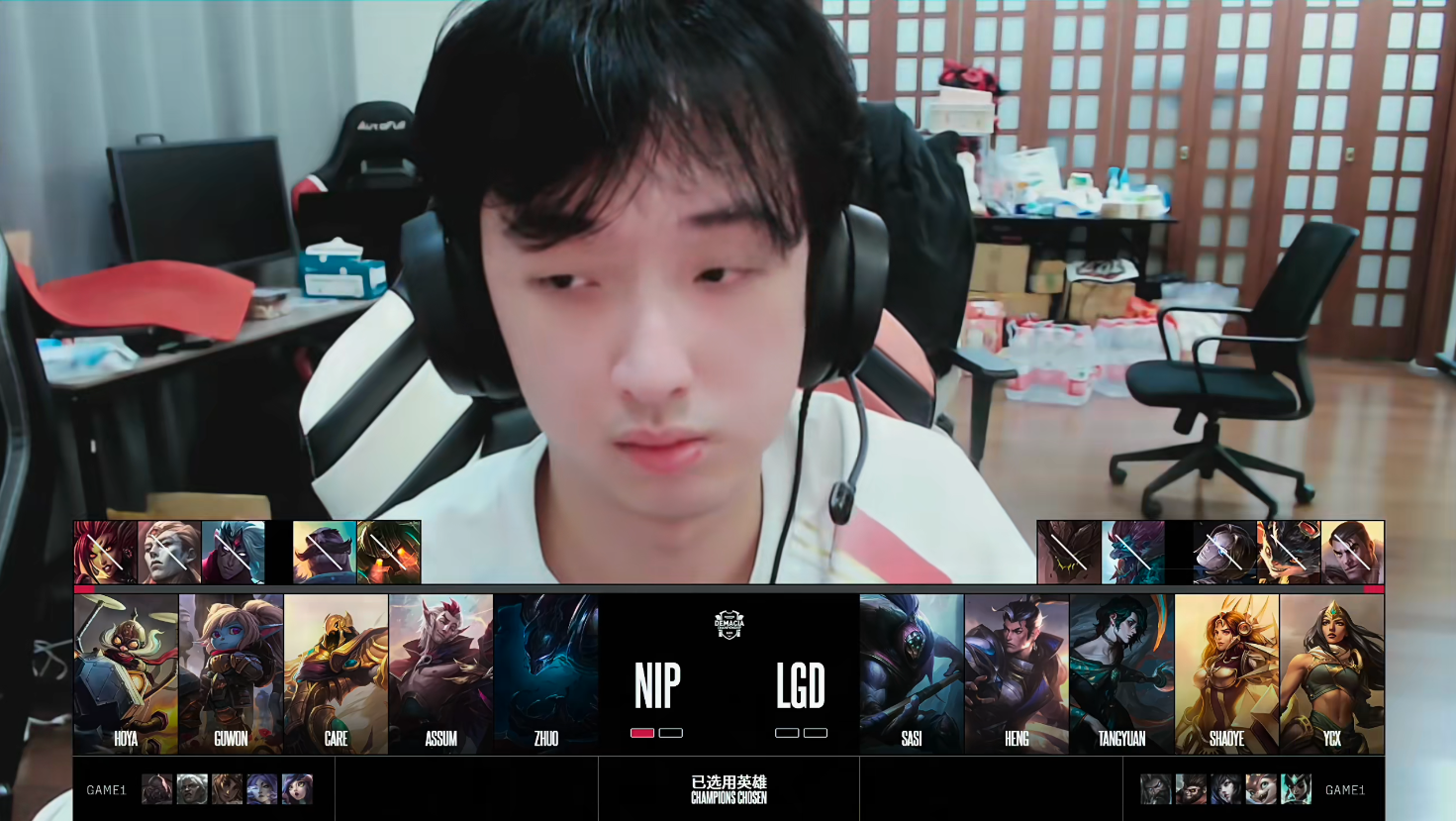 第一局比賽,NIP藍色方,禁用:婕拉;亞恒;波比;辛德拉;韋魯斯,選用:HOYA塞恩;Guwon狼母;Care巖雀;Assum蕓阿娜;Zhuo妮蔻;LGD紅色方,禁用:杰斯;發條;蘭博;卡莎;女槍,選用:sasi烏迪爾;Heng猴子;Tangyuan阿貍;Shaoye小火龍;Ycx卡爾瑪