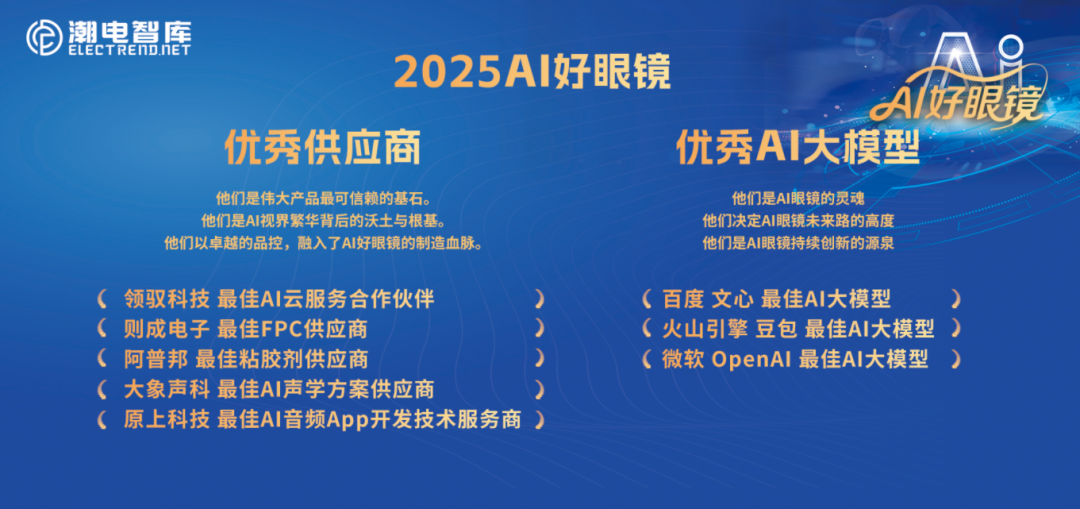 領馭科技(最佳AI云服務合作伙伴)、則成電子(最佳FPC供應商)、阿普邦(最佳粘膠劑供應商)、大象聲科(最佳AI聲學方案供應商)、原上科技(最佳AI音頻APP開發(fā)技術服務商)