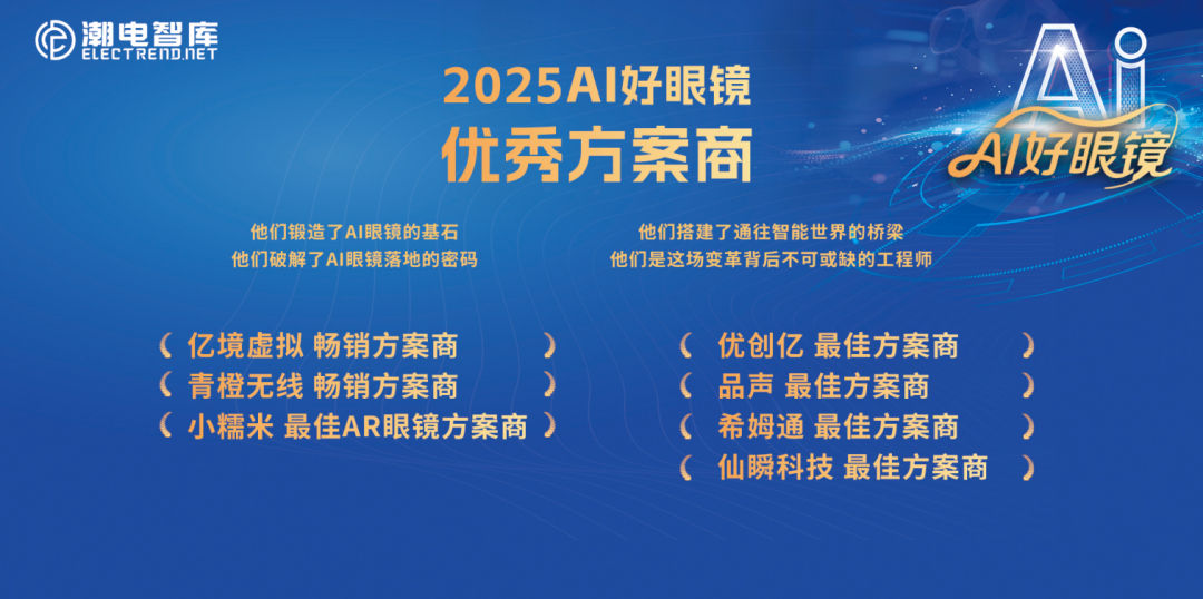 億境虛擬(暢銷方案商)、青橙無線(暢銷方案商)、小糯米(最佳AR眼鏡方案商)、優(yōu)創(chuàng)億(最佳方案商)、品聲(最佳方案商)、希姆通(最佳方案商)、仙瞬科技(最佳方案商)