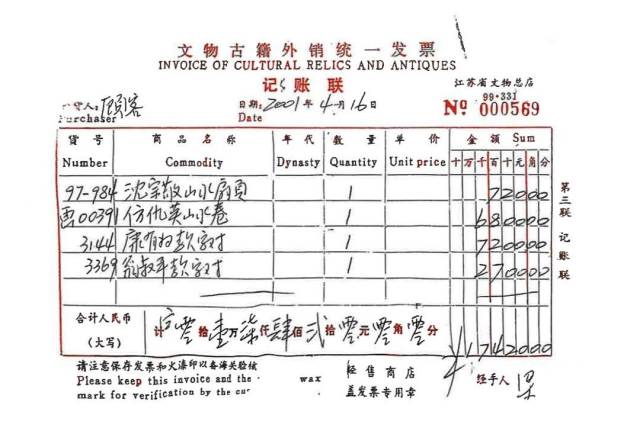 南京博物院稱,這件《江南春》圖卷被相關鑒定人員認定為“偽作”“不宜入藏”之后,1997年4月15日,該院向原江蘇省文化廳提交報告,請求“將不夠館藏標準的文物(即博物館的處理品)進行調劑,價撥給省文物總店處理”。原江蘇省文化廳于1997年4月21日同意調劑。1997年5月8日,被專家認定為贗品的《江南春》圖卷撥交給原江蘇省文物總店,并于2001年4月16日被買走。在發票記賬聯上,買方姓名登記為“顧客”,商品名稱登記為“仿仇英山水卷”,單價6800元。該“顧客”同時還購買了其他3件書畫作品,合計17420元。
