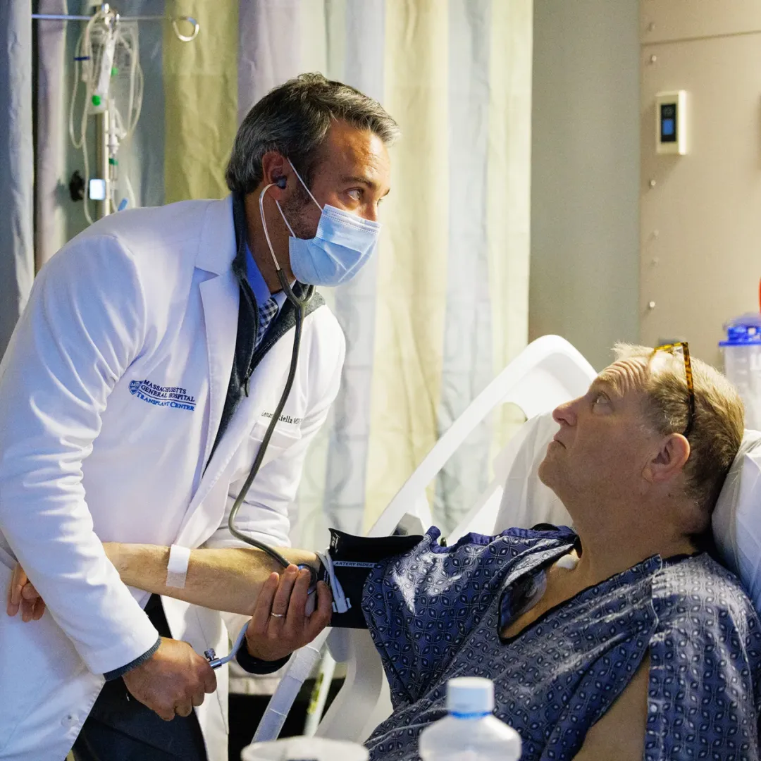 麻省總醫院腎移植醫療主任萊昂納多·里埃拉在蒂姆·安德魯斯接受豬腎移植手術后查看他的情況。圖片來源:美國《連線》雜志網站