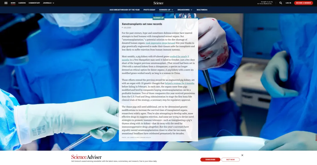 今年,異種移植取得關鍵突破。借助基因工程改造的豬器官,研究人員顯著延長了動物器官在人體內的存活時間。一名美國患者接受的69處基因改造豬腎在體內工作近9個月,刷新工程化豬腎移植紀錄;在中國,一名女性移植的僅改造6個基因的豬腎也維持了幾乎同樣長的時間。這些成果遠超此前維持紀錄。盡管挑戰猶存,今年的突破無疑讓異種移植距離真正走向臨床應用更近一步。